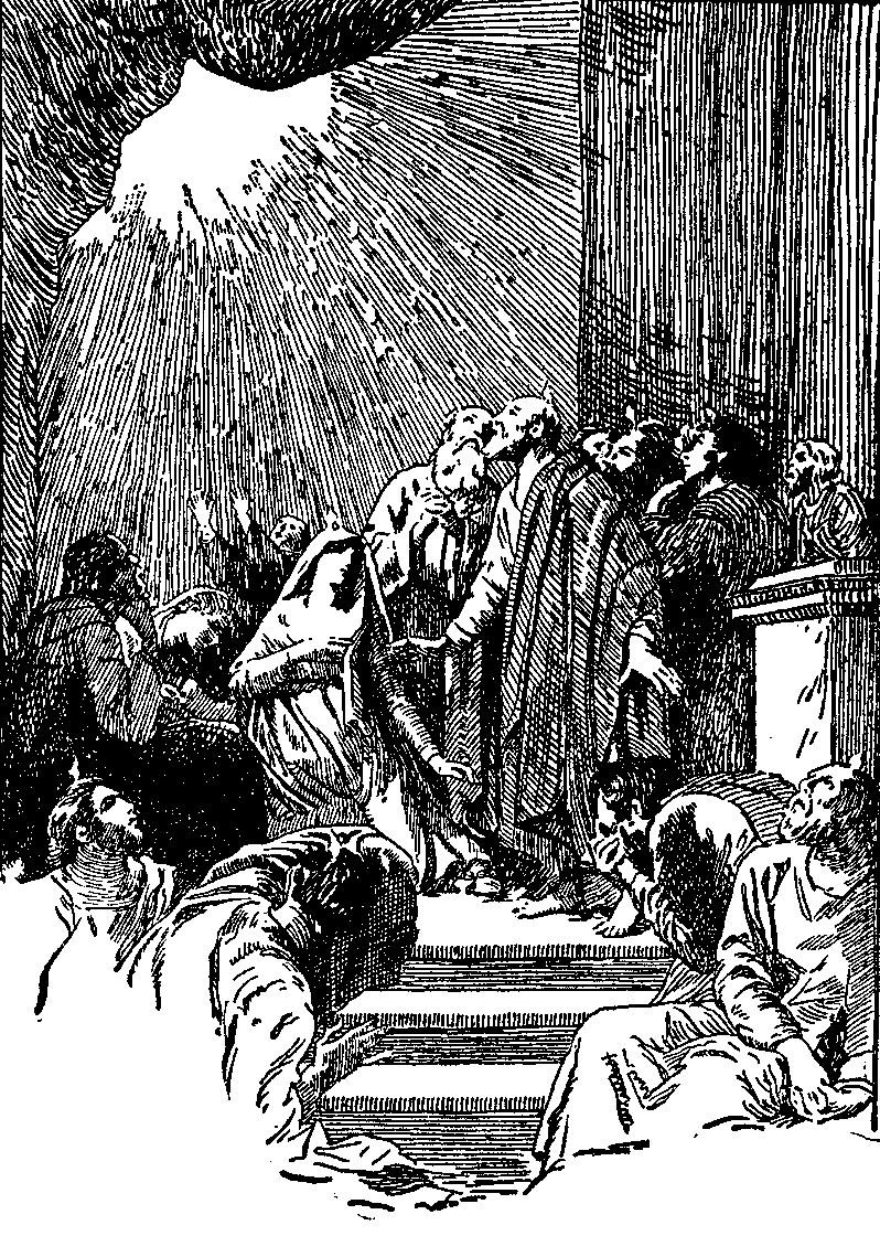 [22]The divine plan means the arrangement made by Jehovah for the creation of everything that has been created and for carrying out his purposes with reference to his creatures. The first one to understand the divine plan was Jesus, who prior to coming to earth was known as the Logos, which means one who speaks and acts for Jehovah. In Revelation, chapter 5, a wonderful picture is given in symbolic language. Jehovah is pictured as seated upon his throne, holding in his right hand a record or scroll of his great plan. The hand is a symbol of power and holding it in his hand foreshadowed the fact that Jehovah held it exclusively in his own power and keeping. The picture then shows a strong angel or messenger speaking with a loud voice and asking the question: "Who is worthy to open the book and to loose the seals thereof?" In heaven there was a host of holy beings or angels. No one of them was able to open the book or scroll, neither to look on it. No one in earth was able to look upon it nor to open it.