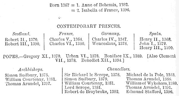 Walsingham. Annales Ricardi Secundi et Henrici Quinti (Rolls’ series). Chronique de la Traison et Mort de Richard (English Historical Society). M. Wallon’s Richard II. is said to be the best modern book on the subject. Wright’s Political Songs (Rolls’ series).