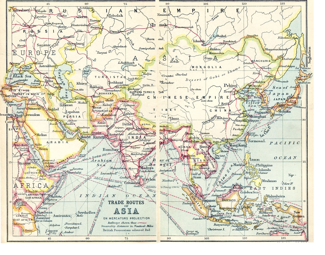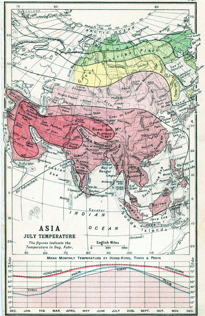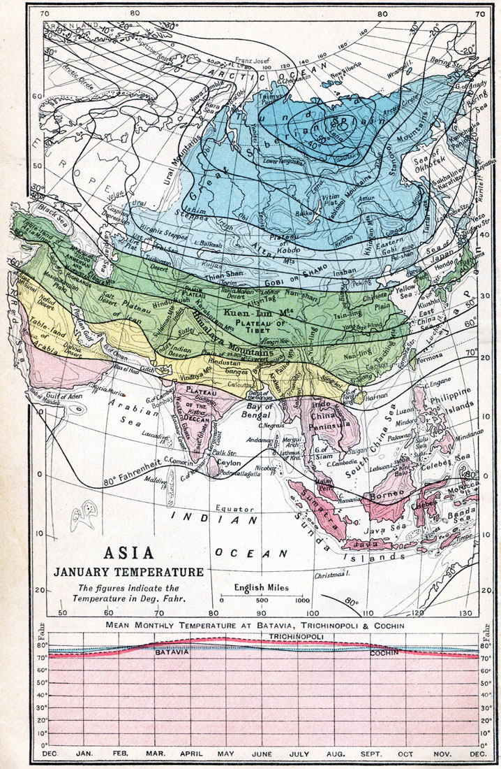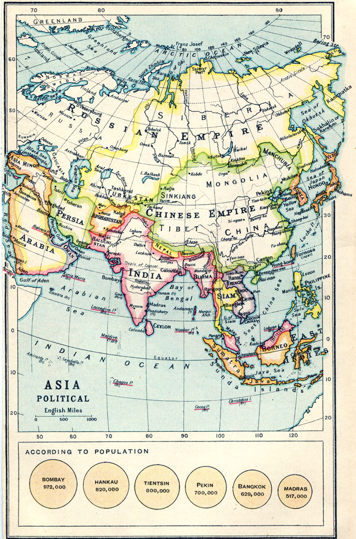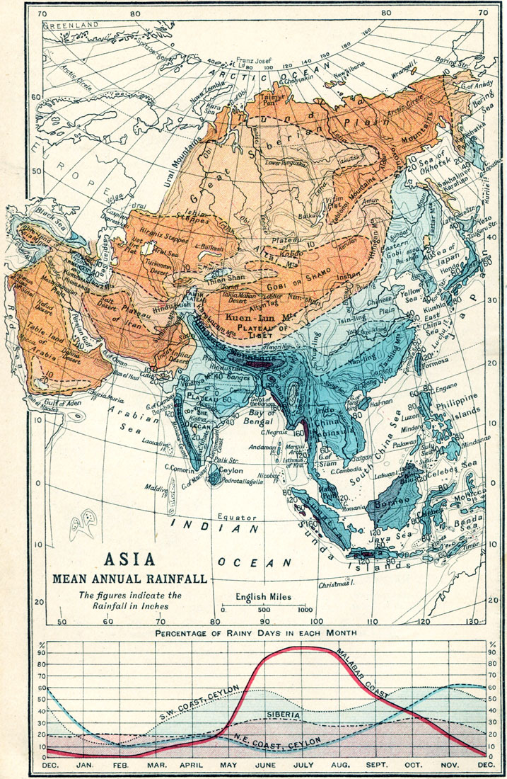 But Asia, as Japan has taught us and as China will undoubtedly teach us again, has her own destiny to bear out, apart from our European interests and politics; and it is in that aspect we need to study her on the lines laid down and made clear and positive in this volume. It is not the military records, the charts of mutinies and battle-fields, interesting as they are, which are alone important; but those showing the conditions, physical and climatic, of the country; the dispersion of the tongues, the sites of the old religions, the wealth and tillage of the earth with its fruits, grain and minerals, its rice fields and tea plantations; the prevalence of rain, sun and trade-winds; and the course of the sea-roads that affect its human and industrial life.