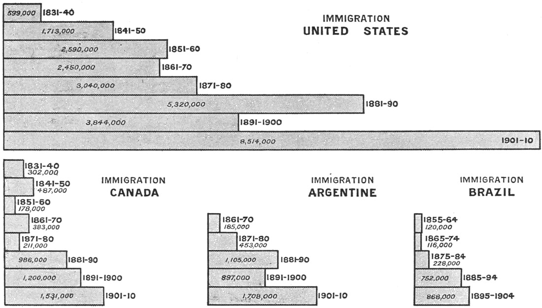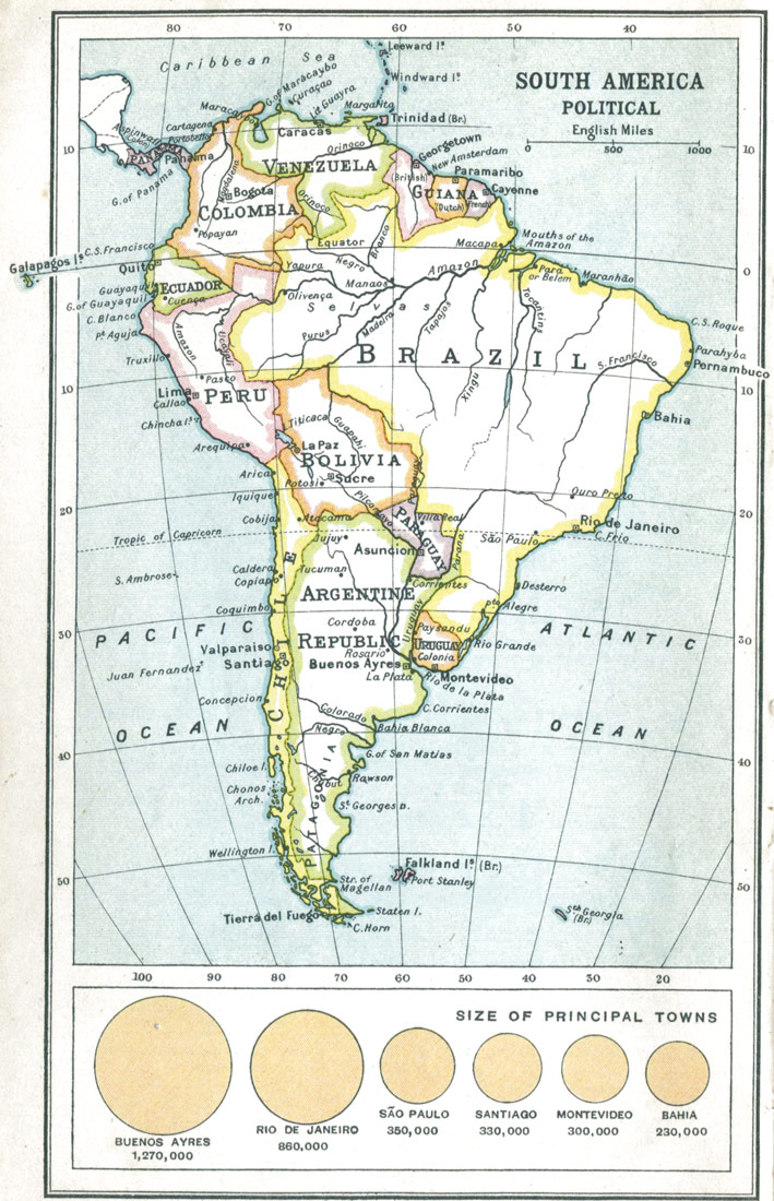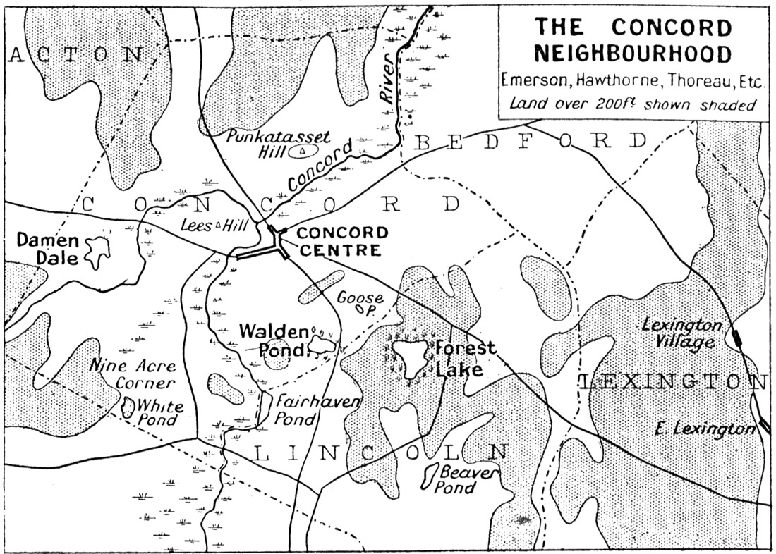 As for the local associations that have become familiar in American literature, you have a chart of the Concord neighbourhood showing Walden Pond, Forest Lake, Lexington, and Punkatasset Hill, associated with the name and fame of Ralph Waldo Emerson, Nathaniel Hawthorne, and H. D. Thoreau. Fenimore Cooper recalls the old Indian Territory as it was in the wild prime of the Red Men; and you travel from the land of "Hiawatha" in Longfellow's poem southwards to the Mexico and Peru of Prescott, and then pause over something more amazing than any record in imaginative verse or prose—the plain statistics figured in the map of South America, and the emergence of Buenos Ayres with its million and a quarter inhabitants, Rio de Janeiro with its 860,000, San Paulo with 350,000, and Santiago with 330,000. Here are the elements of an immense new Latin civilisation which is going to count, and count enormously, just as China and its millions are bound to count enormously in the twentieth century.