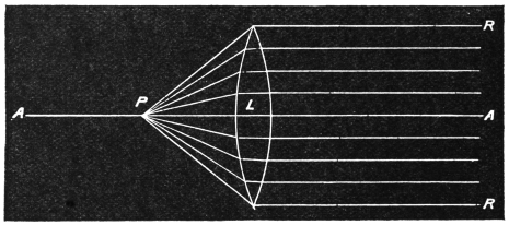 Every convex lens has one “principal” focus, and an infinite number of “conjugate” foci. The principal focus is the distance at which it brings together in one point the rays which fall upon it parallel to its axis, as shown in Fig. 1, in which A is the axis of the lens L, and the rays RR are brought together in the principal focus P. Thus a ready means of finding the focal length of any lens is to see at what distance it forms an image of the sun, or of any other distant object, upon a screen, such as a piece of smooth white cardboard. In the figure this distance will be PL. Conversely, if the source of light be at P, a parallel beam of light will be emitted from the lens.