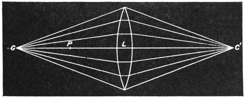 These points will be seen on reference to Fig. 2, in which L being the lens, and P the principal focus, as before, rays from the point C are brought together at the conjugate focus C', at the same distance on the other side of L. In this case it manifestly does not matter whether the object be at one or the other of these points.