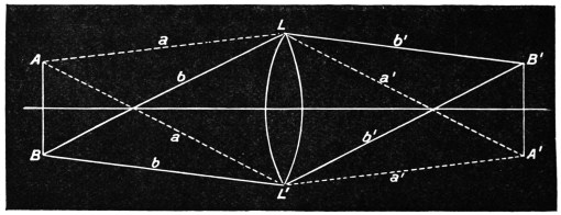 So far we have been dealing with points on the line of the axis of the lens. The facts mentioned apply equally, however, to rays entering the lens at an angle to the axis, only that in this case they diverge or converge, correspondingly, upon the other side. It is evident, from Fig. 1, that no image is formed of a point situated at the distance of the principal focus; but Fig. 3, which is really an extension of Fig. 2, shows how the rays passing along secondary axes form an inverted image of the same size as the object, when the latter is situated at twice the focal length of the lens from this last. To avoid confusion, the bounding lines only are shown, but similar lines might be drawn from each and every point of the object; and if the lines ALA', BL'B' be supposed to be balanced at L and L' respectively, they will indicate the points at which the corresponding parts of the object and image will be situated along the lines AB, B'A' respectively. Moreover, rays pass from every part of the object to every part of the lens, so that we must imagine the cones LAL', LA'L' to be filled with rays diverging on one side of the lens and converging on the other.