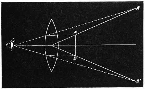 The microscopic image, on the other hand, is a virtual image, which can be viewed by the eye but cannot be thus projected, for it is formed by an object placed nearer to the lens than the principal focal length of the latter, so that the rays diverge, instead of converging, as they leave the lens, and the eye looks, as it were, back along the path in which the rays appear to travel, and so sees an enlarged image situated in the air, farther away than the object, as shown in Fig. 4. In this case, as the diagram shows, the image is upright, not inverted.
