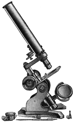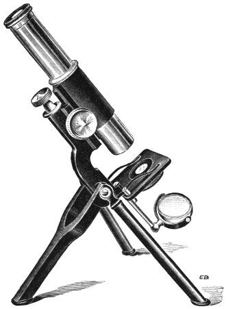 So much may suffice for the simple microscope. We pass on now to the consideration of the instrument which forms the subject of the present work, an instrument which, whilst moderate in price, is yet capable of doing a large amount of useful and valuable work in the hands of a careful owner, and of affording him a vast amount of pleasure and recreation, even if these be his only objects in the purchase, though it is difficult to understand that, an insight being once attained into the revelations effected by the instrument, without a desire being excited in any intelligent mind to pursue the subject as a study as well as a delightful relaxation. The microscope described, and adopted as his text by the author of this work, is still made, and has shared to a very considerable extent in the general improvement of optical apparatus which has taken place during the last thirty years. It is to be obtained from Baker, 244 High Holborn, and is provided with most of the apparatus which will be found indispensable by the beginner, costing, with a case in which to keep it, the modest sum of three guineas.