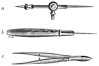Of accessory apparatus, we may mention first the stage forceps (Fig. 9, a). These are made to fit into a hole upon the stage, so as to be capable of being turned about in any direction, with an object in their grasp, and for some purposes, especially such as the examination of a thin object, say the edge of a leaf, they are extremely useful.