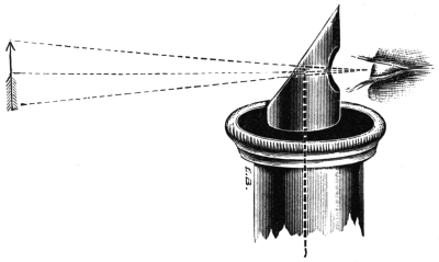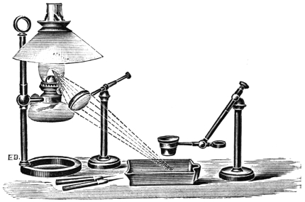 We suppose the microscope to be inclined at an angle of about 70° to the horizontal, with a low-power objective attached to it, a one-inch by preference. Opposite to the microscope, and about a foot away from it, is a lamp with the edge of the flame presented to the microscope, the concave mirror of which is so arranged as to receive the rays from the flame and direct them up the tube of the microscope. Upon the stage is placed a piece of ground-glass, and the mirror-arm is now to be moved up or down upon its support until the ground-glass receives the maximum of illumination, which it will do when the lamp-flame is at one conjugate focus of the mirror and the ground-glass at the other. The focus will not be an image of the flame, but a bar of light.