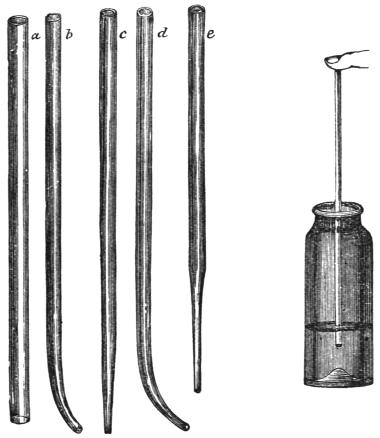 As to the tools required, they are neither numerous nor expensive. Fine-pointed but strong forceps (Fig. 9, c), curved and straight; a couple of pairs of scissors, one strong and straight, the other more delicate, and having curved blades, and a few needles of various thicknesses and curves, are the chief ones. The latter may be made by inserting ordinary needles, for three-fourths of their length, into sticks of straight-grained deal (ordinary firewood answers best), and thereafter bending them as required. A better plan, however, is to be provided with a few of the needle-holders shown in Fig. 9, b. These are very simple and inexpensive, and in them broken needles are readily replaced by others. Dipping-tubes, such as are shown in Fig. 12, will also be extremely useful for many purposes. These are very easily made by heating the centre of a piece of soft glass tubing of the required size, and, when it is quite red-hot, drawing the ends apart. The fine tube in the centre should now be divided by scratching it with a fine triangular file, and the scratch may of course be made at such a point as to afford a tube of the required fineness. The edges should be smoothed by holding them in the flame until they just run (not melt, or the tube will close). These tubes can often be made to supply the place of a glass syringe. They may be used either for sucking up fluid or for transferring it, placing the finger over the wide end, allowing the tube to fill by displacement of air, and then re-closing it with the finger. This last method is especially useful for transferring small objects from one receptacle to another. In speaking of the dissection of objects, it should have been mentioned that the microscope itself may, under careful handling, be made to serve very well, only, as the image is reversed, it is almost impossible to work without using a prism to re-erect the image. Such a prism is shown in Fig. 13. The microscope is placed vertically, and the observer, looking straight into the prism, sees all the parts of the image in their natural positions. This appliance is extremely useful for the purpose of selecting small objects, and arranging them on slides in any desired manner. A few words may be added as to the reproduction of the images of objects.