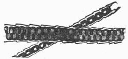 On this page is the magnified image of a single hair, taken from the long-eared bat. It will be seen that the outline of the hair is deeply cut, and the markings run in a double line. These markings and outlines are caused by the structure of the hair, which is covered with a regular series of scales adhering but loosely to its exterior. These scales can be removed by rough handling, and therefore the aspect of the hair can be much altered.