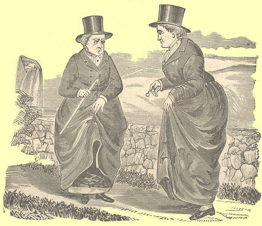 Lady Eleanor Butler and Miss Ponsonby were Irish ladies of rank and beauty, who loved each other with an affection so true that they could never bear the idea of the separation which the marriage of either would necessitate. They, therefore, resolved on lives of celibacy, and, refusing many handsome offers, fled from home. They were, however, overtaken and brought back to their respective relations. Many attempts were made to draw Miss Butler into marriage, but all were in vain. In a short time the ladies eloped again, each having a small sum with her; and it was said that, although Lady Eleanor arrived here in the natural aspect of a maid of 34, Miss Ponsonby accompanied her in the guise of a smart footman, in top boots and buskin breeches. It was about the year 1778 when these errant ladies visited Llangollen. While rambling along this charming locality, their eyes rested on a gentle eminence near the village, and there they resolved to fix their abode. They, accordingly, purchased the estate, built a new cottage on the site of the old one, laid out gardens, pleasure grounds, rural walks and bridges, by which they might enjoy the natural charms of this picturesque retreat. Their mode of life being very singular, and their costume still more so, they soon became noticed by the many travellers who passed through North Wales. The celebrated comedian Charles Mathews thus describes their appearance:—p. 3“As they are seated, there is not one point to distinguish them from men; the dresses and powdering of the hair, their well-starched neckcloths, the upper part of their habits (which they always wear, even at a dinner party) made precisely like men’s coats, with regular black beaver hats, everything contributing to this semblance. To crown all, they had crop heads, which were rough, bushy, and white as snow.”