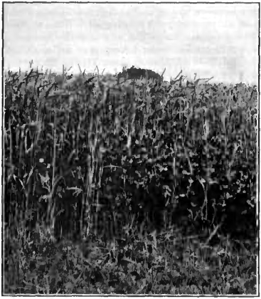 When crimson clover is seeded alone on good soil it is likely to make so rank a growth as to lodge. To overcome this difficulty it is a common practice to seed some small-grain crop with the clover at seeding time. South of the Potomac River winter oats are ordinarily very [ 14 ] satisfactory, especially when seeded with the late white-blooming strain of crimson clover. In Delaware and eastern Maryland wheat is commonly used. In addition to wheat and oats, rye or barley is sometimes used. The customary rate of seeding is about 15 pounds of clover seed and 30 pounds of grain per acre. The accompanying illustration (fig. 5) indicates the appearance of a field seeded to a mixture of crimson clover and wheat. The grain prevents the clover from lodging, facilitates the curing of the clover hay, and, in addition, forms a valuable constituent of the resulting hay crop. The yield of the mixture is ordinarily somewhat more than when the clover is seeded alone. The Alabama State Agricultural Experiment Station secured as the average for two years' experiments the following yields of hay: