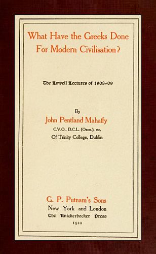 THESE lectures, delivered in Boston at the invitation of the Curator of the Lowell Institute, in December and January, 1908-9, are now published owing to many requests both from those that heard them and from those that did not. They are an attempt to cover the whole field of Greek influence, not only in the various arts in which such influence is generally realised, but also in those departments of thinking in which moderns arrogate to themselves an unquestioned superiority. Yet it will be found, even in the following necessarily brief and popular sketch, that, as regards thinking, the Greeks were as supreme in science as in other departments, and, though they did not discover the powers of steam or electricity, they nevertheless carried out in mechanics works that no modern builder, with all his vaunted control of nature, has yet equalled, and so in other pursuits, not only Greek form, but Greek thought, has been the greatest and the clearest that the world has yet seen.{vi}