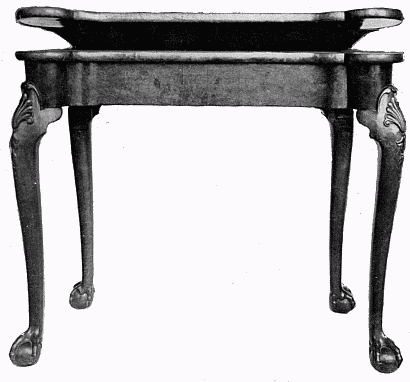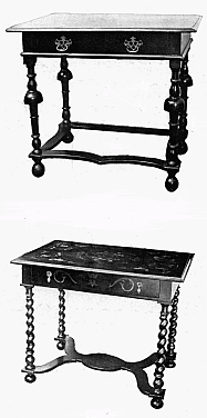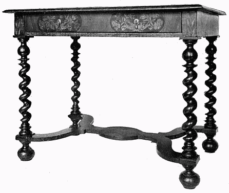 [5] Fine tables of this type are very expensive. One such was sold at Christie's in June 1911 for fifty-eight guineas. It was thus described: "A William and Mary walnut-wood table, with one drawer, the top inlaid with a chariot, flowers and birds, in marqueterie of various woods, on turned legs with X-shaped stretcher—38 in. wide."