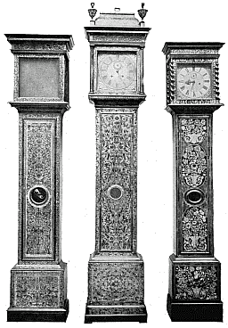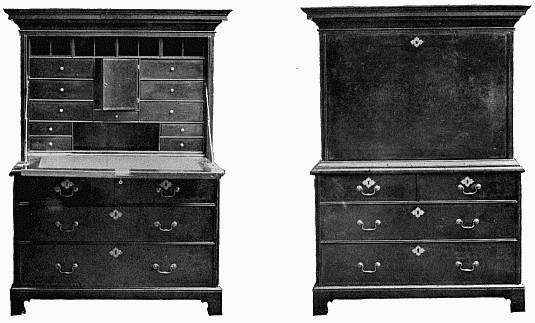 The Queen Anne style has probably been over-praised, a little misunderstood, and possibly a trifle harshly treated. Mr. Ernest Law, whose studies of this period we have already mentioned, describes it as "nothing better than an imitation of the bastard classic of Louis XIV., [9] as distinguished from the so-called 'Queen Anne style' which never had any existence at all except in the brains of modern æsthetes and china maniacs," and as a case in point refers to Queen Anne's drawing-room at Hampton Court Palace. This verdict is no doubt a true one as regards the schemes of interior decoration, with their sprawling deities and the gaudy and discordant groupings of classical figures of Verrio and his school, to be seen at Hampton Court and other great houses. Verrio, as Macaulay wrote, "covered ceilings and staircases with Gorgons and Muses, Nymphs and Satyrs, Virtues and Vices, Gods quaffing nectar, and laurelled princes riding in triumph"—a decorative scheme which certainly does not err on the side of parsimony. The taste of a Court, however, is by no means a criterion of taste in domestic furniture. There can be no doubt that to this period we are indebted for the introduction of various articles of furniture of great utility and unquestionable taste. The chairs and tables in particular, depending as they do for charm upon simple lines and the transverse grain of the wood, for neatness of design and good workmanship are unsurpassed. Amongst other pieces the bureaux and long-cased clocks made their appearance; also double chests of drawers or tallboys, mirrors for [10] toilet-tables and wall decoration; and washstands came into general use, as well as articles like card-tables, powdering-tables, &c.