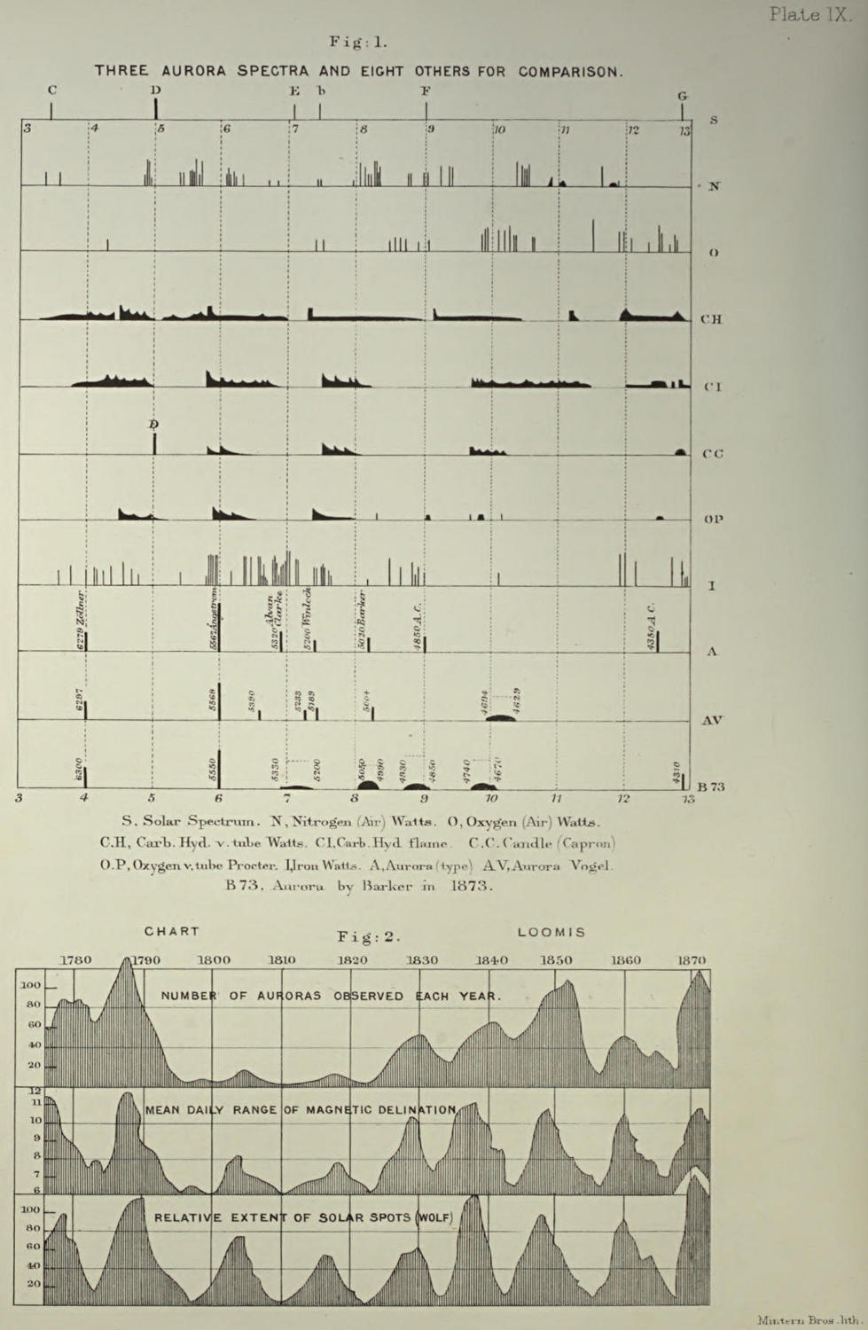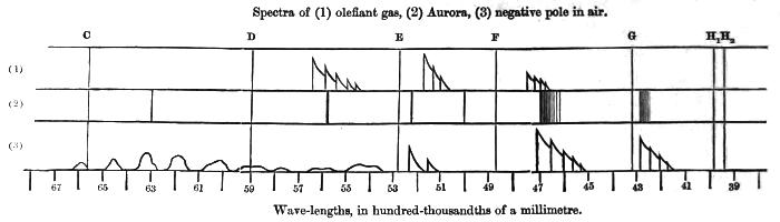 In this case the conditions of pressure on these air-strata are themselves so different that, within certain limits, each will yield its own peculiar spectrum; but we shall see the sum of collective spectra, so to speak, spread out behind each other; and therefore the impossibility of attaining a perfect agreement between the Aurora-spectrum and the artificially exhibited spectra of mixed gases is evident.