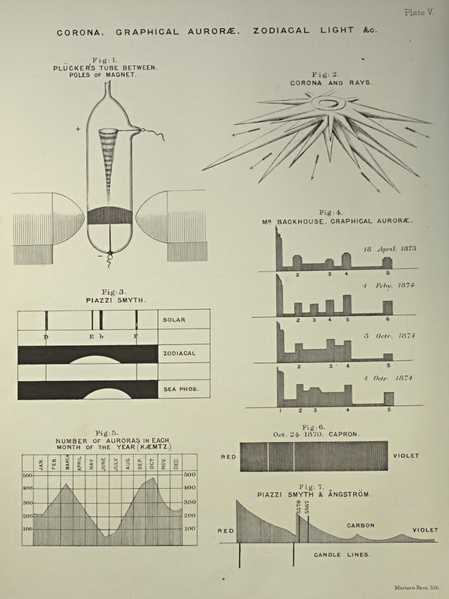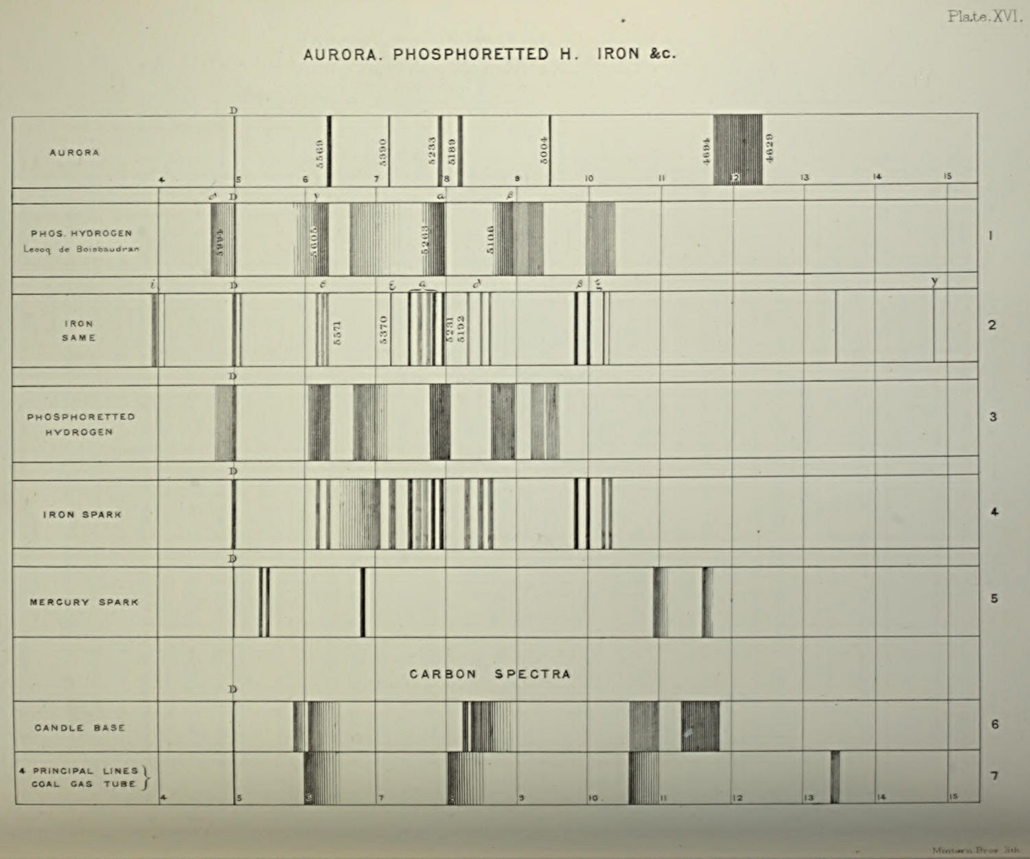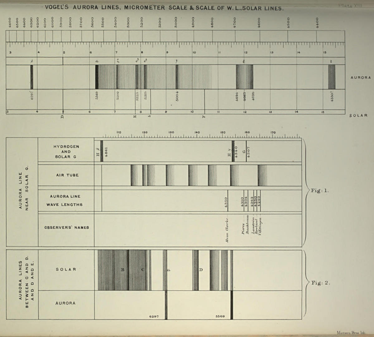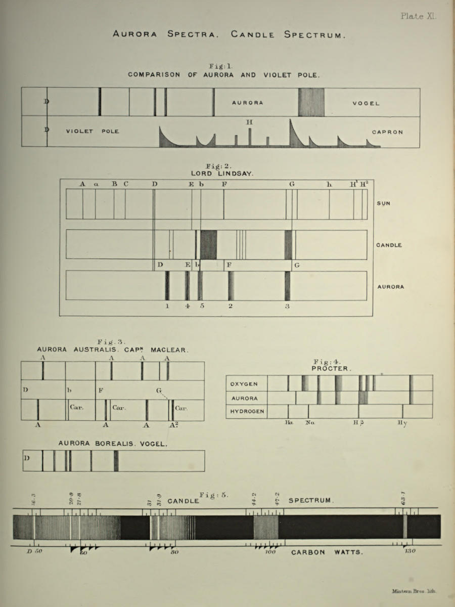 [13] There seems to be some confusion as to the W.L. here given; 5567 is usually accepted as Ångström’s line, while Prof. Smyth refers to it as 5579. The position, too, when examined with a spectroscope of greater dispersion, is not exactly over the citron-line of acetylene, both the above referred to lines lying somewhat more towards the violet end of the spectrum (see Plate V. fig. 7).