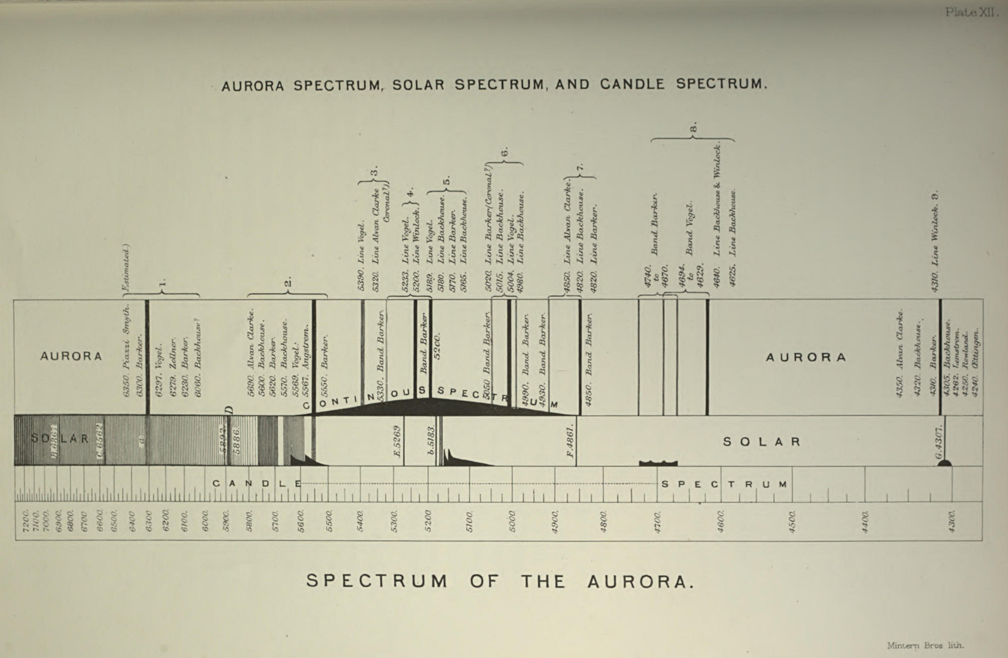 A comparison of the Aurora-spectrum with the spectra of inorganic substances may be easily worked out by the help of the above-quoted wave-lengths of the single lines of the former, with due regard to probable errors, and with the aid of Ångström’s Atlas of the Solar Spectrum. Here the perfect harmony of the brightest Aurora-line (which was fixed with an exactitude of about one seventh of the separation of the sodium-lines) with the lines of the iron-spectrum is especially striking. The wave-lengths in the above-cited observations of the bright Aurora-line vary between 556·9 and 557·3, whilst, according to Ångström, two lines of the iron-spectrum are situated at 556·85 and 557·17.