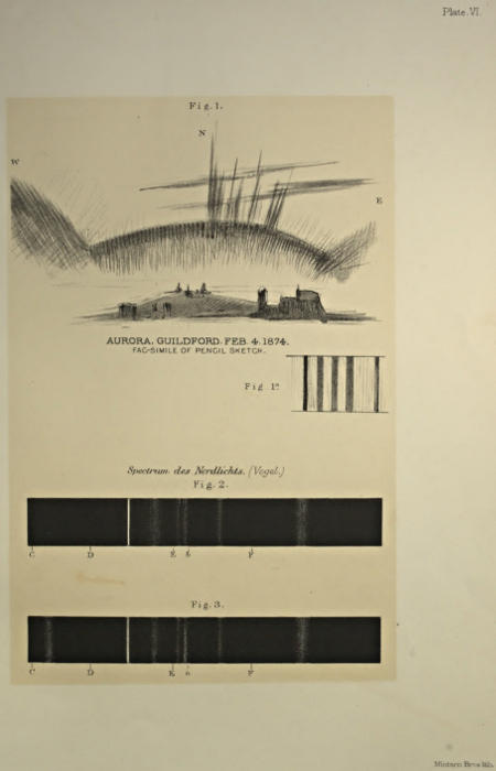 Hence it is no wonder that the Aurora has always received a considerable amount of attention at the hands of scientific men. Early explorers of the Arctic Regions made constant and important observations of it and its character; and the list of references to works given in the Appendix will show how often it formed the subject of monographs and communications to learned Societies. The early contributions seem relatively more numerous than those of a later date; and the substance of them will be found well[vi] summed up in Dr. Brewster’s ‘Edinburgh Encyclopædia’ (1830), article “Aurora.” A most complete and able epitome of our more recent experience and knowledge of the Aurora and its spectrum has been contributed by my friend Mr. Henry R. Procter to the present (9th) edition of the ‘Encyclopædia Britannica,’ article “Aurora Polaris.” It is, however, a drawback to Encyclopædic articles that their matter is of necessity condensed, and that they rarely have the very desirable aid of drawings and engravings to illustrate their subjects. In spite, therefore, of the exhaustive way, both as to fact and theory, in which the contributor to the ‘Encyclopædia Britannica’ has realized his task, it seemed to me there was still room left for a popular treatise, having for its object the description of Auroræ, their characters and spectra. The question of the Aurora spectrum seems the more worthy of extended discussion in that it still remains an unsolved problem. In spite of the observations and researches of Ångström, Lemström, and Vogel abroad, and of Piazzi Smyth, Herschel, Procter, Backhouse, and others at home, the goal is not yet reached; for while the faint and more refrangible lines are but doubtfully referred to air, the bright and sharp red and green lines, which mainly characterize the spectrum, are as yet unassociated with any known analogue.