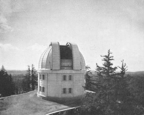 The general idea of an astronomer’s work, as gathered from the questions and remarks of visitors, is that he sits at the eyepiece of the telescope sweeping the heavens in a search for new planets, comets or stars. The absolute futility of such a use of the telescope is evident when it is realized that the main field of the 72-inch covers only about one hundred-millionth of the sky and if only five seconds was required to examine each field it would take more than a lifetime to go over the whole sky once. A second misconception is the idea that large telescopes are used for visual observations of the planets with special reference to their habitability. No work is being attempted at this or other large observatories[31] on planetary detail for which about an 18-inch refractor gives the best results and such a large telescope as the 72-inch is quite unsuited. All scientific observations with the 72-inch are made photographically and it is only arranged for visual use on Saturday evenings when for two hours visitors are allowed to observe the heavenly bodies. A third misconception is that the astronomer only works at night. However true this idea may have been in the days of visual observations when the measurements were made at the eyepiece, there is certainly now, when photography is so generally applied, more day than night work in astronomy. Besides the advantages of permanency, accuracy of measurement and power of recording objects beyond the range of the keenest eyesight, the photographic method has the further great advantage that an hour’s exposure may give sufficient material for several days’ measurement and discussion.