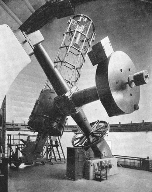 The mechanism by which the rotation of the earth is compensated for is called the driving clock and is contained in the case L, Fig. 2, at the north side of the south pier. In the lower half of the case a governor similar to the governor of a steam engine is driven once per second by a train of gears in the upper section actuated by a weight of 300 pounds below the floor. If the speed of the governor tends to increase the balls raise by centrifugal force and bring increased friction to bear thus reducing the speed to normal while if the speed tends to decrease, the balls drop and reduced friction quickly allows it to accelerate to normal speed. A shaft with a coarse screw thread on it, called technically a “worm” and situated at the top of the case, is driven by intermediate gearing from[18] the governor at the rate of one revolution every two minutes. The thread on this shaft engages into teeth cut in the worm wheel G, Fig. 2, which is 9 feet in diameter. As there are 720 teeth very accurately spaced in this worm wheel, it is driven around by the worm in 2 × 720 = 1,440 minutes, 24 hours, the same rate as the earth. This worm wheel, normally loose on the polar axis on which it turns on ball bearings, allowing the axis to be moved freely to any position, can be rigidly clamped to it by pressing a button. When this is done, it will evidently turn the polar axis and hence the tube at the same rate as the earth but in the opposite direction, on an axis parallel to the axis of the earth, thus exactly compensating for the rotation of the earth. Hence any star at which the telescope is pointed will automatically remain central in the field. Owing to the great magnification all this mechanism requires the highest grade of workmanship, else there will be wandering of the image, a most annoying and troublesome defect. Few telescopes are entirely free from periodic error and that the 72-inch drives so regularly and smoothly is a great advantage and evidence of the perfection of workmanship throughout.