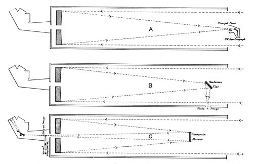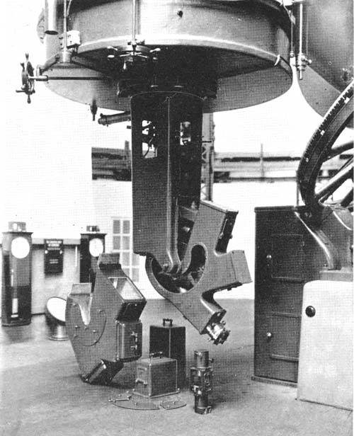 The most generally useful arrangement of the 72-inch telescope is, however, the Cassegrain form, so called from the French astronomer who first used it. About 7 feet below the focus, the conical reflected pencil from the 72-inch mirror is intercepted by a convex mirror of the same size as the Newtonian and of about 10 feet focal length as seen in C, Fig. 5, and also shown in Fig. 2 and 3. This mirror turns the light downward and, after passing through the central hole, forms the image of the star about two feet below the mirror surface on the slit of the spectrograph or on a visual attachment as shown. The significant property of this combination is that the focal length is increased from 30 to 108 feet without changing the tube length in a somewhat similar manner to the action of a telephoto lens. It has the same size of image and magnifying power as a refractor with a tube 108 feet long and has the decided advantage of a much shorter tube and smaller dome. Observations with this arrangement are made at the lower end of the tube from the observing floor and[26] with much greater ease and convenience than at the upper end. Changes from the Cassegrain to the Newtonian or Principal Focus arrangements are readily effected by a device due to the genius of Mr. Swasey whereby only the mirrors and attaching tubes require to be handled, instead of the whole upper end of the tube as in previous reflectors.