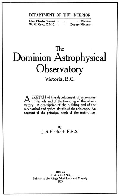 This observatory is a branch of the Department of the Interior of the Federal Government, the department which has charge of the administration of the western lands of the Dominion. In the colonization of these lands, one of the obvious first needs was a survey of the boundaries and subdivision into townships and sections. This need led to the organization of a surveys branch of the department and out of the necessity of accurate astronomical observations to delimit the boundaries and define the position of the base lines for subdivision work arose the astronomical branch. The first Chief Astronomer of Canada, the late Dr. W. F. King, was a man of sterling integrity and remarkable ability and to his genius must be ascribed in large degree the present development of astronomy in Canada. As Chief Astronomer and H. M. Commissioner of International Boundaries, he[6] early realized the need of an observatory for an initial meridian, for housing and standardizing the instruments, and for some astronomical research. He was successful in having the fine Dominion Observatory erected on the Experimental Farm, Ottawa, in 1905 which housed the Astronomical Branch, the staff of the International Boundary Surveys and later the Geodetic Survey of Canada, of which he was the first superintendent.