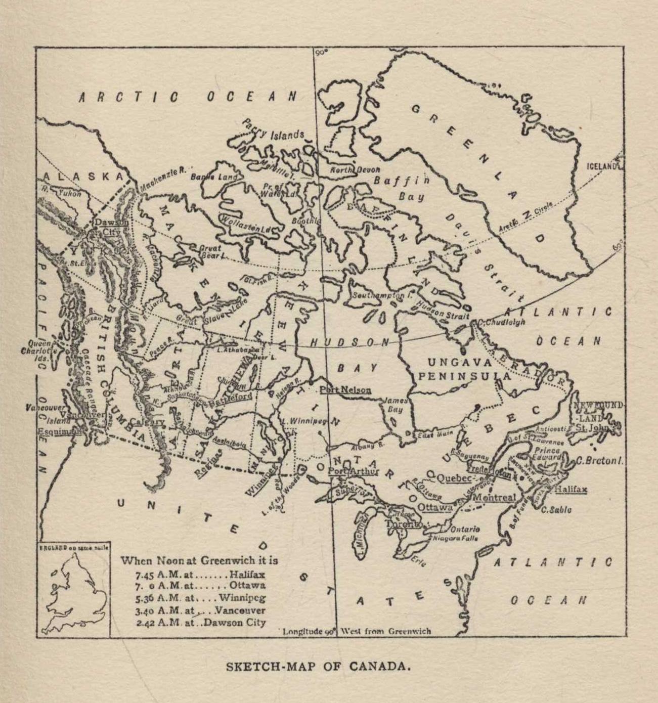 This is Canada, a land that comprises fully one-third of the 12,000,000 square miles of the British Empire, thirty times as large as England, Ireland, and Scotland combined—not much less in area, in fact, than the whole of Europe. You may realize its breadth by thinking that if you were to get on a train at Halifax on the east, on Monday morning, and travel by the Imperial limited—a very fast train—day and night without stopping, you would not reach Vancouver on the west coast till Saturday morning. In the course of this long journey you would pass through eight large provinces—Nova Scotia, New Brunswick, Quebec, Ontario, Manitoba, Saskatchewan, Alberta, and British Columbia—and you would still miss the island province, Prince Edward, and the great northern territories. Here is a heritage of the Anglo-Saxon race, a new nation indeed, part of the greatest Empire in the world, being fashioned and built up with marvellous rapidity.