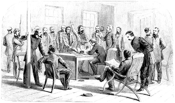 A fierce bombardment continued along the Union lines surrounding Petersburg, and on the 2d of April, the 6th, 9th, and the Provisional Corps, after a short but terrible struggle, seized and tore up the long coveted Southside Railroad, capturing many prisoners and guns. Richmond and Petersburg, being thus rendered untenable, were evacuated during the same night, and occupied by Union troops on the morning of April 3, 1865. Pausing not for a moment, however, General Grant pressed on in the hopes of capturing the defeated rebel general and his army. At Deep Creek, Paine’s Cross-roads, Deatonsville, Farmville, High Bridge over the Appomattox, and Appomattox Station, actions of greater or less severity were a27fought with the rebel army, which now, thoroughly demoralized, was strewing the road with deserted artillery, wagons, and supplies, which were passed unnoticed and untouched by the Union troops in the heat of their unremitting and exultant pursuit. At length, on the 7th, General Grant at Farmville, sent a note to Lee, requesting the surrender of the Confederate Army of Northern Virginia. Pressing on, still in relentless pursuit, he was met at Appomattox Station, on the morning of the 9th, by a note from General Lee asking for an interview with a view to the surrender of his command. The same afternoon, at Appomattox Court-house, he received the surrender of the rebel chieftain, on terms which were liberal in the extreme. The war was now virtually ended, and Grant, passing through Richmond, went to Washington, and on the 14th took the cars for a visit to his family, then in New Jersey, but was overtaken en route by the terrible news of the assassination of President Lincoln, and the tragic events caused by a plot, of which it seems that he had been one of the marked victims.