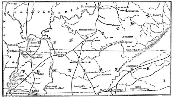 Brigadier-General Grant was now sent with a large force into Southern Missouri, then threatened by the rebel general, Jeff. Thompson. He superintended the erection of fortifications at Ironton and Marble Creek, and having garrisoned both places, hastened to the defense of Jefferson City, which he protected from rebel attack for ten days. Thompson having abandoned his purpose, Grant was next ordered to the command of the important post of Cairo, Ill., which commanded the Ohio and Upper Mississippi rivers, and was a depot of supplies for an extensive region. This district included Western Kentucky, whose citizens were at that time trying to remain “on the fence,” until they could better see which side was to succeed; and General Grant, learning that the rebels had finally crossed the lines, and possessed themselves of Columbus and Hickman, on the Mississippi, and Bowling Green, on the Green River, promptly availed himself of the opportunity of seizing positions within the State furnished by these violations of Kentucky’s proposed neutrality, and quietly sent troops (September 6) up the Ohio, to Paducah, at the mouth of the Tennessee, and (on the 25th) to Smithland, at the mouth of the Cumberland River—thus effectually closing two of the principal avenues through which the rebels obtained supplies of food, clothing, arms, etc., from the North. He next turned his attention to Columbus, Ky., then held by the rebel Major-General Polk, but was prevented from attacking him by the withdrawal of a large portion of his force to St. Louis; and on the 11th, learning that the rebel general, Jeff. Thompson, was contemplating a raid through southwestern Missouri, he sent an expedition which defeated and routed him near Dallas, on the 21st of October. Then, being apprised of Jeff. Thompson’s intention to blockade the Mississippi River, and move upon his own position at Cairo, he determined to break up the camp at Belmont, Mo., where the rebels were concentrating. a10At the head of two brigades, he moved down the Mississippi in steamers. On the 6th of November they reached Belmont, marched rapidly upon the enemy’s camp, two and a half miles distant, forced their way over all obstructions, and surprised the rebels, capturing camp equipage, artillery, small arms; burning tents, blankets, etc., and capturing many prisoners. On their return to the steamers, however, the victorious Union army was met by about 4,000 rebel troops, who, under command of Generals Polk, Pillow, and Cheatham, were hastening to reinforce their comrades, and a fierce battle ensued. The Union force, although losing some of the prisoners it had taken, succeeded in reaching the river, and embarking again in safety, under cover of gun-boats, bringing with them two cannon which they had taken, and spiking two others, which they were obliged to leave. The advantages of this fight, on the whole, were with the Union troops, who also gained new confidence in themselves, and in their commander.