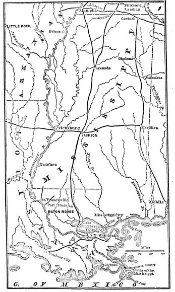 On the 13th of April, General Halleck, with a powerful army, composed of sixteen divisions under Generals Grant, Buell, and Pope, advanced from Pittsburg Landing to the attack of Corinth. On the 17th May, the Union army commenced a series of regular approaches to the town, which Grant was anxious to carry (as he was confident of his ability to do) by assault. Halleck refused, and a quarrel ensued between the two, the only one recorded in Grant’s military career. On the night of the 28th, the rebels evacuated the closely invested city, moving southward along the Mobile and Ohio Railroad, to a safer position. New Orleans and Memphis had, meanwhile, surrendered to the Union flag. On the 17th, General Halleck was appointed General-in-Chief of the United States armies, and Grant was assigned to the command of a newly created department of West Tennessee, embracing Northern Mississippi, West Tennessee, Western Kentucky, and Southern Illinois. His head-quarters were at Memphis, which he quickly cleared of the illicit traffic carried on by crafty secessionists, gamblers, speculators, and smugglers. Grant now determined to attempt the reduction of Vicksburg, the key to the navigation of the Mississippi, strong by nature, and rendered apparently impregnable by military science. Even before its fortifications were completed, in the summer of 1862, Admiral Farragut’s squadron had made no impression upon it; and General Williams’s attempt to turn the current of the river through a canal cut across the peninsula, formed by the bend of the stream in front of the city, had proved a failure. After full preparation for the enterprise, General Grant, in December, began his movement down the Mississippi Central Railroad, in order to flank Vicksburg, which was to be attacked at the same time on the north and northwest, by Sherman descending a15the river from Memphis. His plans, however, were deranged by the pusillanimity of the colonel commanding at Holly Springs, where his chief depot of supplies was established, and he was obliged to forego his expected junction with Sherman. The latter general, unsupported by Grant, and unaware of the cause of his failure, attacked Vicksburg; but after three days’ hard fighting, was obliged to abandon the assault. Grant next descended the Mississippi to Young’s Point, a little above Vicksburg, and at first renewed the canal project, which was rendered futile by a sudden flood in the river; then he attempted an entrance to the Yazoo, by the old Yazoo Pass, and afterwards by a circuit through Steel’s and Black’s bayous, Duck and Deer creeks, and Rolling Fork and Sunflower rivers. All these attempts failing to meet the emergency, he determined—despite the numerous and apparently insuperable difficulties which presented themselves—to attack the fortress and city from below. Sending a part of the gun-boat fleet, and sixteen or eighteen transports laden with forage and supplies, past the batteries on two different nights,—a most heroic act, which was accomplished with only the loss of two transports,—General Grant marched his army through the country west of the Mississippi to Hard Times, La., a distance of seventy miles, over roads well-nigh impassable, accomplishing the distance in thirty days. The gun-boats, after an ineffectual attempt to capture Grand Gulf as a base of operations, ran the batteries in the night, and on the morning of March 30, commenced to ferry over the troops to Bruinsburg, ten miles below. This was more easily effected, inasmuch as a simultaneous demonstration by General Sherman against Haines’s Bluff, attracted all their attention in that direction. From Bruinsburg, Grant’s army moved rapidly to Port Gibson, thus flanking Grand Gulf, which was evacuated by the rebels, and immediately occupied by the Union forces as a base of operations. Here, also, they were quickly joined by General Sherman’s army, and, as had been previously arranged by Grant, Colonel Grierson starting from Lagrange, at a16the junction of the Mississippi Central with the Memphis and Charleston railroads, and following the lines of the Mobile and Ohio and Mississippi Central railroads, and the Meridian and Jackson roads, reached Baton Rouge on the 1st of May, having very thoroughly cut the rebel communications. Grant now threw his army between Johnston and Pemberton, routed the former, and drove the latter into Vicksburg, and by the 18th, had completely invested that city on the land side, and was in communication with the squadron and transports by way of Walnut Bluffs, above the river. On the 19th and 22d, assaults were made upon the city, but without decisive results, and a regular siege was commenced, which, after a prolonged and heroic resistance by the people and garrison, resulted in its unconditional surrender on the 4th of July, 1863. 34,620 prisoners, 211 field-pieces, 90 siege guns, and 45,000 small arms fell into the hands of the victors; in addition to which the rebels sustained a loss of 11,800 killed, wounded, or deserters. The Union losses had been 8,575 killed, wounded, and missing. Sending Sherman to Jackson, to defeat and break up the rebel General Johnston’s army, Grant sought and obtained a brief furlough—the first he had enjoyed during the two and a quarter years he had been in the army—in order to visit his family. Returning down the Mississippi—now, thanks to his genius and skill, open to navigation for its whole length—he visited General Banks at New Orleans, and while there (September 4), was seriously injured by a fall from his horse, so that it was not until November that he was able to take an active part in military affairs. He was then given the command of the Grand Military Division of the Mississippi, comprising the armies of the Cumberland, the Tennessee, and the Ohio, and promptly undertook the expulsion of the rebels from the Chattanooga Valley, and the possession of Lookout Mountain and Mission Ridge, from whic