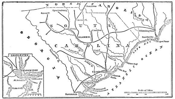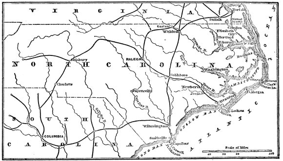 Meanwhile, Sherman sweeping through the Carolinas, had flanked and captured Charleston, S. C., as well as Columbia, Cheraw, Fayetteville, and with the aid of Generals Terry and Schofield, had taken Goldsboro’, Smithfield, and Raleigh, and held Johnston’s rebel army “pinned to the wall.”