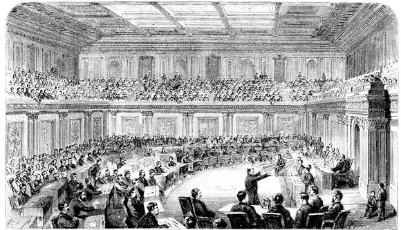 To such a youth, writing for the newspapers was almost a necessity. There had been a paper in South Bend edited for some years by John D. Defrees, since then a Member of Congress and Government printer. To its columns Schuyler contributed often, and he was but little more than twenty-one years of age, when he became editor and proprietor of the St. Joseph’s Valley Register, his friend Defrees having removed to Indianapolis to take charge of the State Journal. Previous to this, however, he and Mr. Defrees, with some other enterprising young men of South Bend, had organized a debating society, and by a happy thought had modeled it after the House of Representatives, whose rules they adopted for their a36governance. Mr. Defrees was for the time the “Speaker” of this Village House of Representatives, and Colfax, yet a youth under age, was “the gentleman from Newton.” Parliamentary rules were insisted upon, and the pages of Jefferson’s and Cushing’s Manuals were carefully and thoroughly conned, till “the gentleman from Newton” became as conversant with the rules and usage of “the House,” as any presiding officer in our State legislatures. This, and the habit of off hand debate, were of great advantage to him in after years, and contributed much to make him, as he is acknowledged to be, by all parties, the best presiding officer the House of Representatives has had for many years.