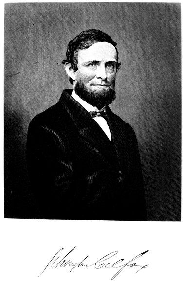 a34In 1822, there lived in North Moore Street, then a quiet, home-like street running westward from West Broadway, New York, a young couple by the name of Colfax. The husband, named like his illustrious son, Schuyler Colfax, was a bank clerk. The child-wife, for she was then but little more than fifteen years of age, looked up confidingly and tenderly to the brave, noble-hearted young man on whom she had bestowed her heart’s affections, and both anticipated a long and joyous future. But ere the new year of 1823 dawned, that young husband was taken from life, and the girl-wife was a widow.