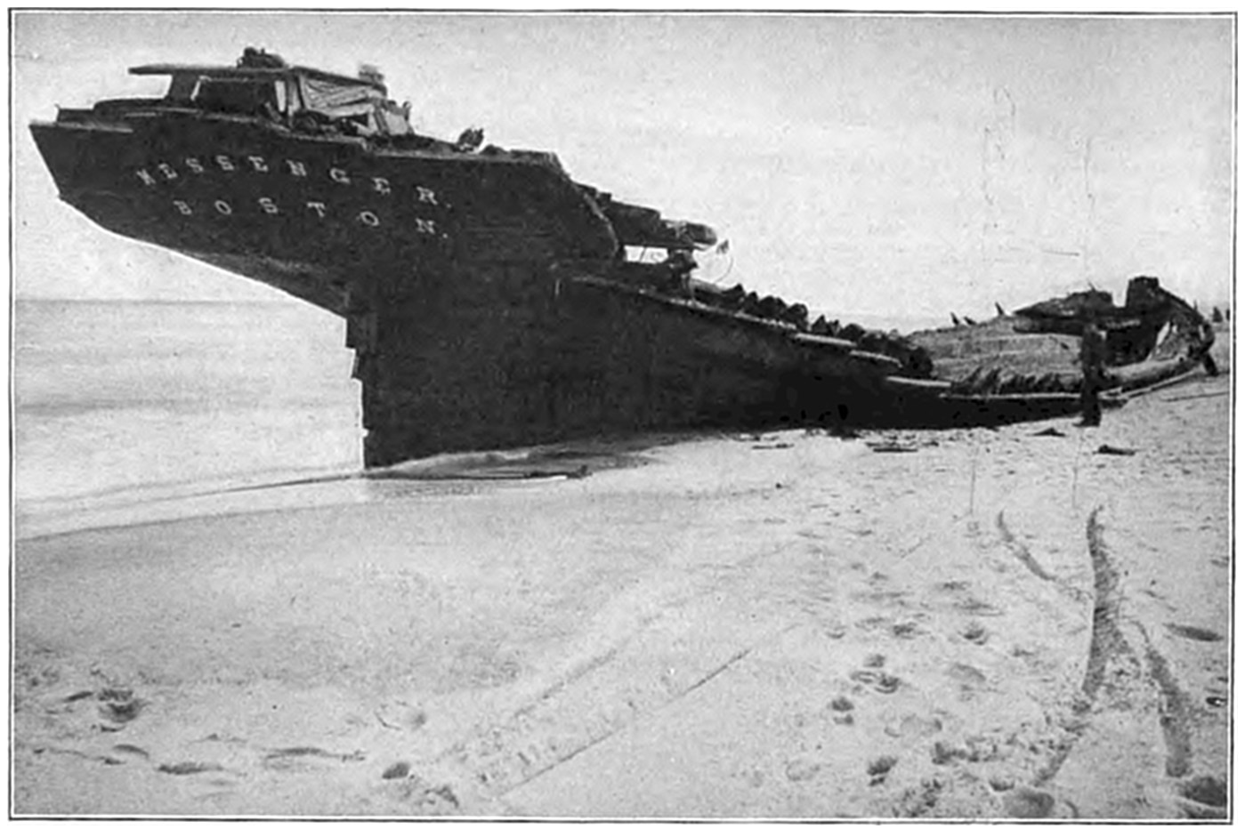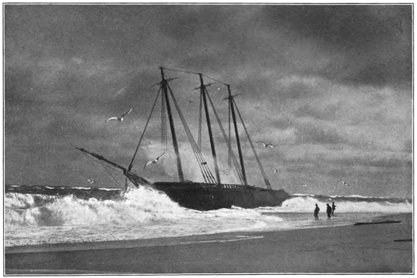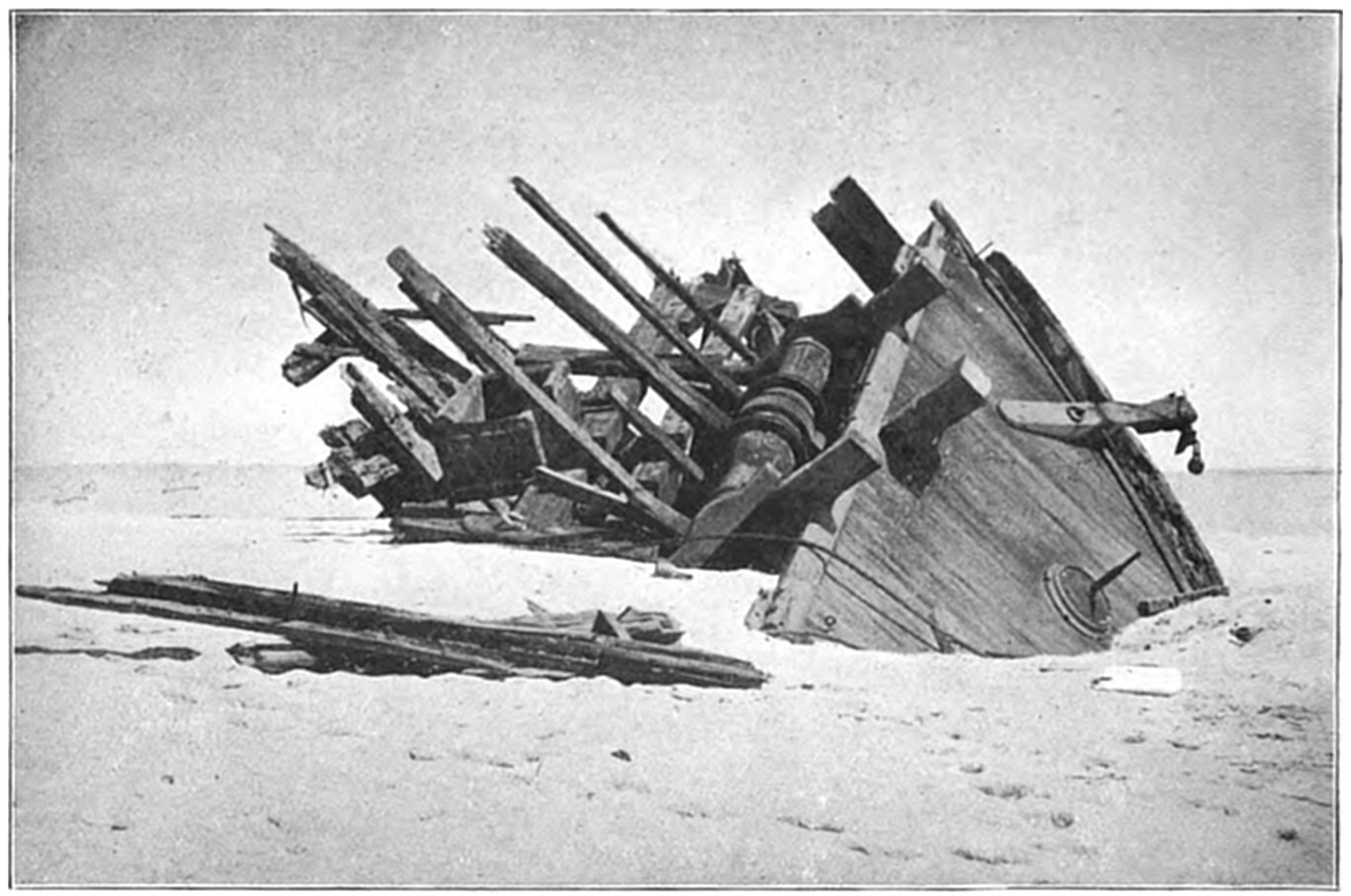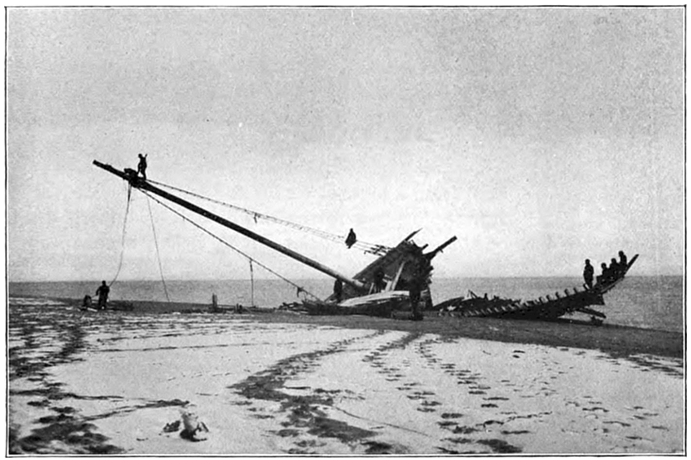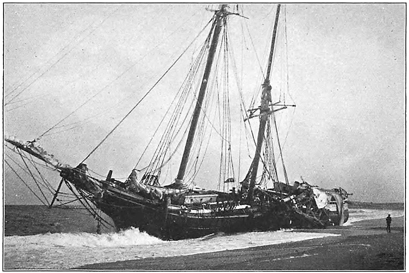 The wrecked vessel was sighted through the storm and a shot promptly fired over the craft, but the crew had perished almost as soon as the ship struck, and the efforts of the life savers were of no avail. The ship (it was afterwards learned from young Evans) broke in two almost as soon as she struck, and the members of the crew perished shortly after. Evans told the author that as soon as the ship struck he put on a life-preserver and took to the rigging. The captain ordered the boats launched, but they were smashed as soon as they struck the water. While clinging to the rigging, considering16 what was best to do, Evans says that he must have been hit by a big wave or wall of water, as the next that he knew he was on the beach and the life savers were taking him to the station. The bodies of twenty of the crew were found and buried in the cemetery at Wellfleet. Evans soon recovered from the effects of the buffeting he received by the seas, and returned to his home in England. Part of the ship is now visible at low tide, and is an object of much interest to visitors to Cape Cod.