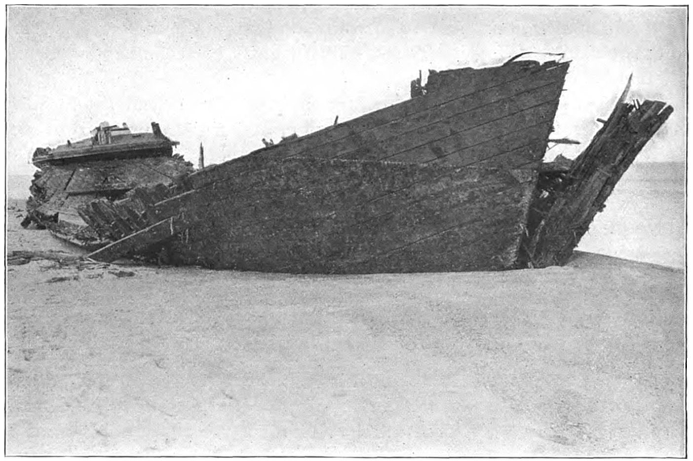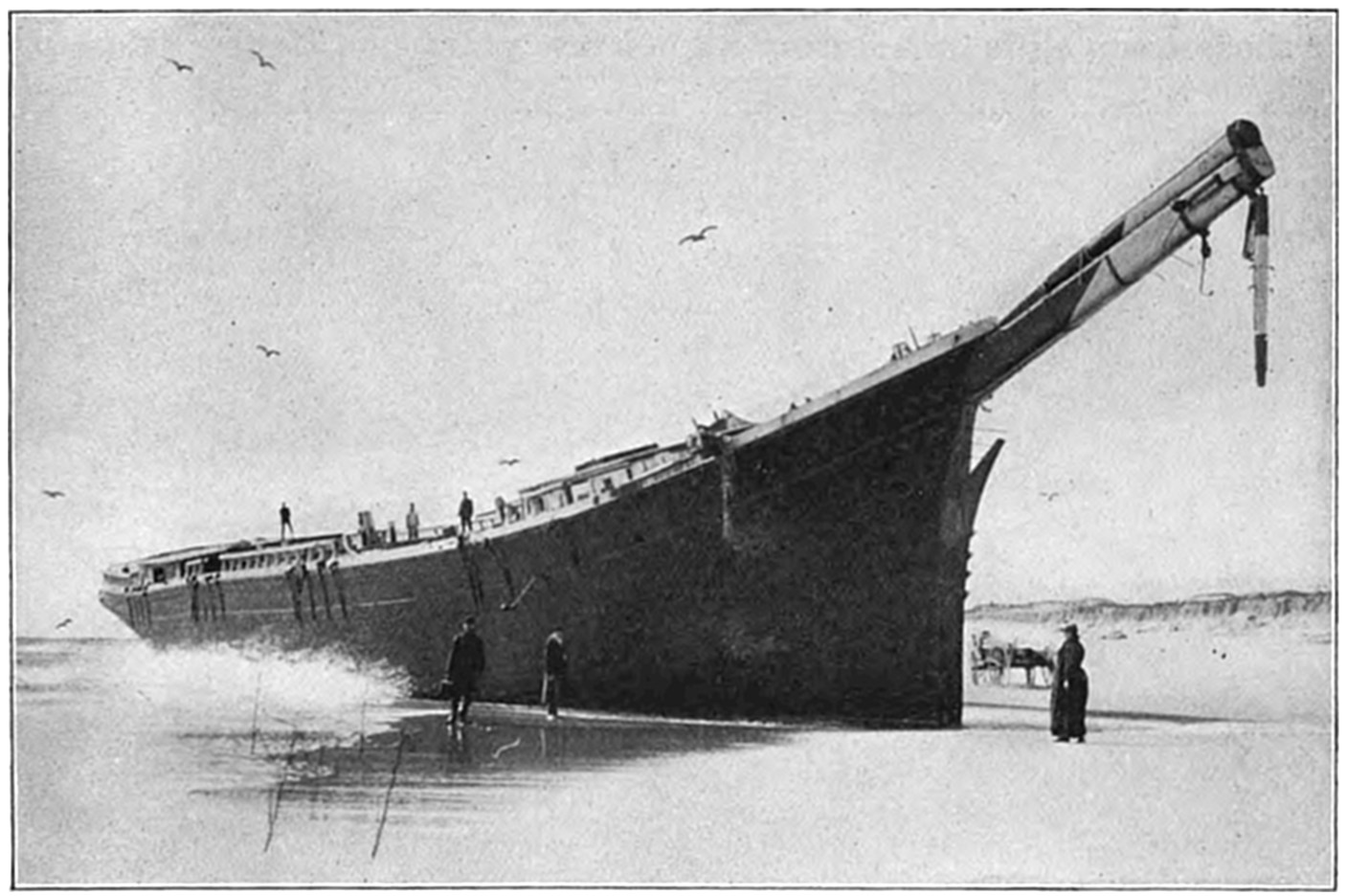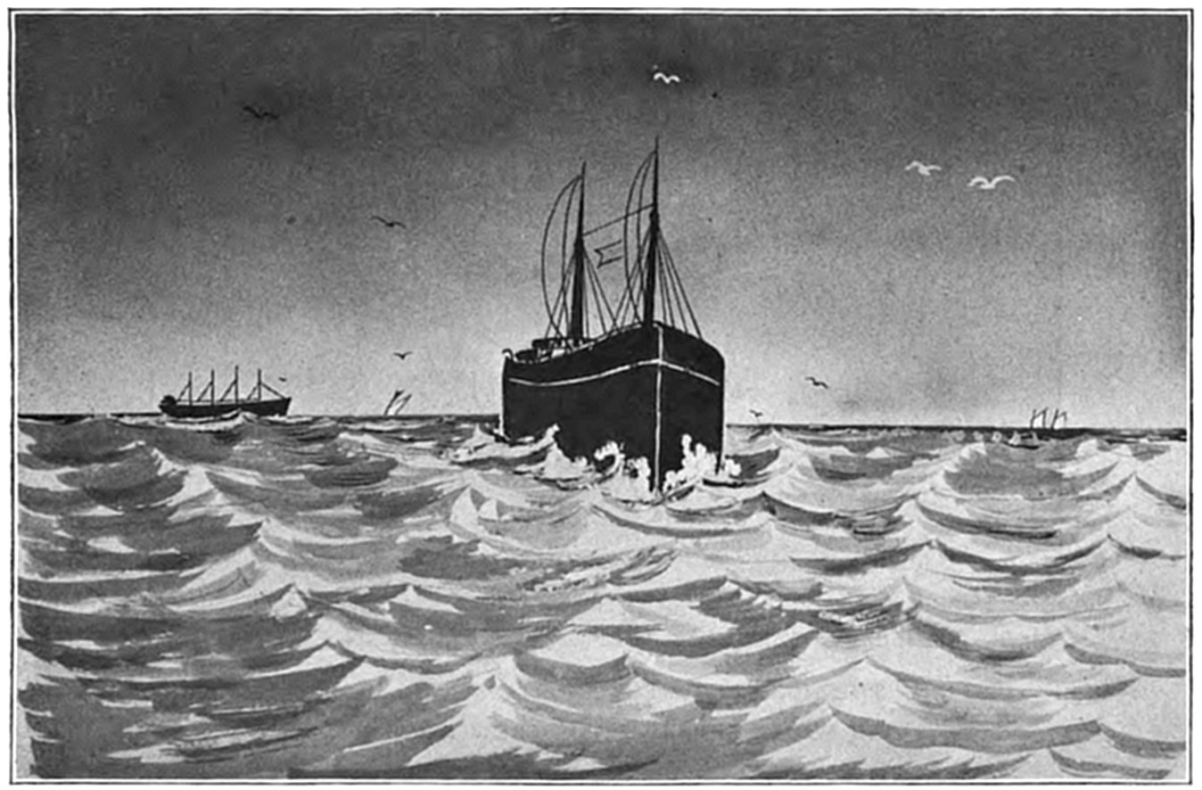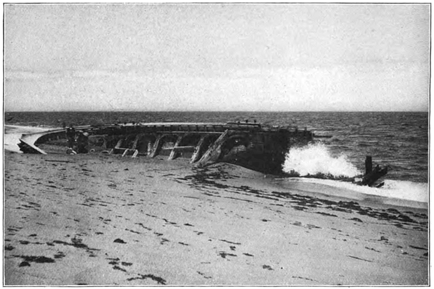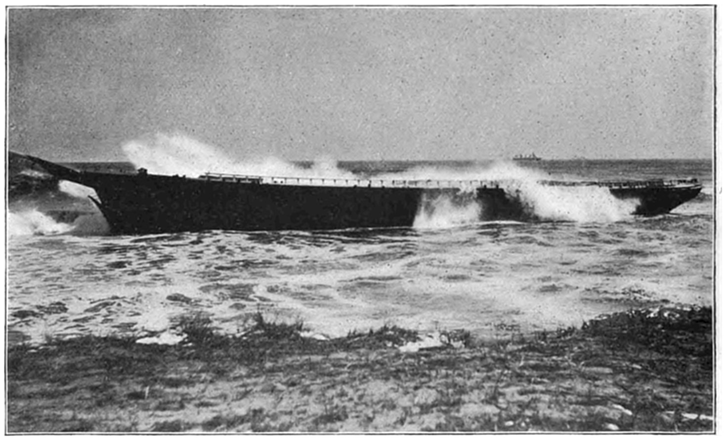 The wrecked vessel was sighted through the storm and a shot promptly fired over the craft, but the crew had perished almost as soon as the ship struck, and the efforts of the life savers were of no avail. The ship (it was afterwards learned from young Evans) broke in two almost as soon as she struck, and the members of the crew perished shortly after. Evans told the author that as soon as the ship struck he put on a life-preserver and took to the rigging. The captain ordered the boats launched, but they were smashed as soon as they struck the water. While clinging to the rigging, considering16 what was best to do, Evans says that he must have been hit by a big wave or wall of water, as the next that he knew he was on the beach and the life savers were taking him to the station. The bodies of twenty of the crew were found and buried in the cemetery at Wellfleet. Evans soon recovered from the effects of the buffeting he received by the seas, and returned to his home in England. Part of the ship is now visible at low tide, and is an object of much interest to visitors to Cape Cod.