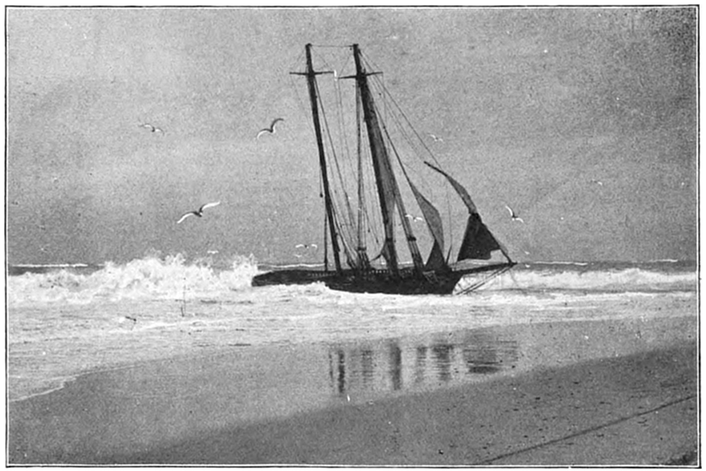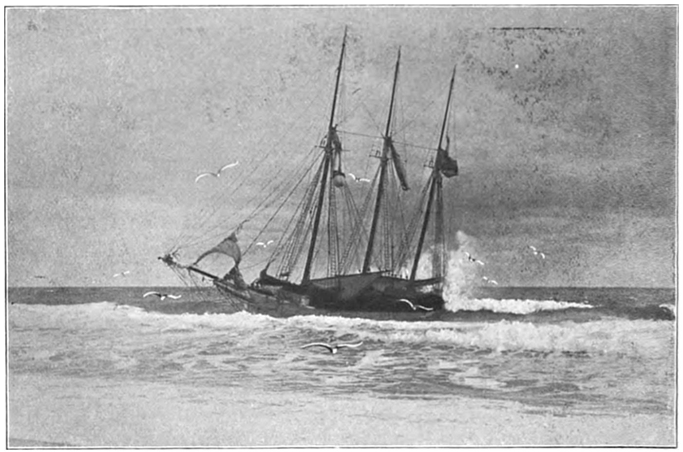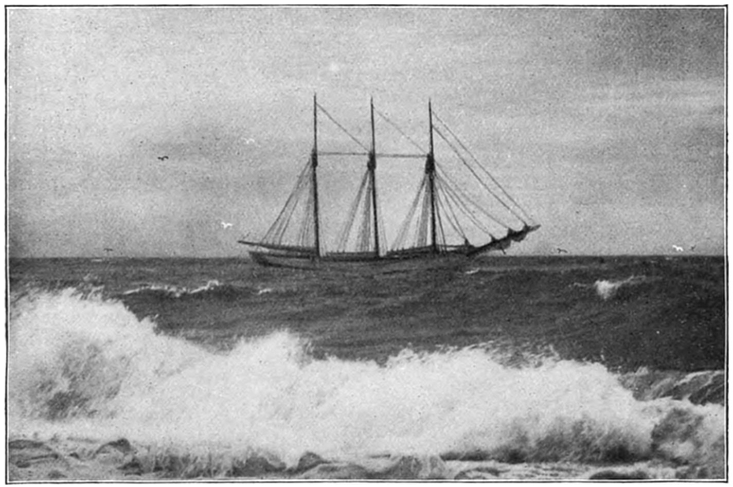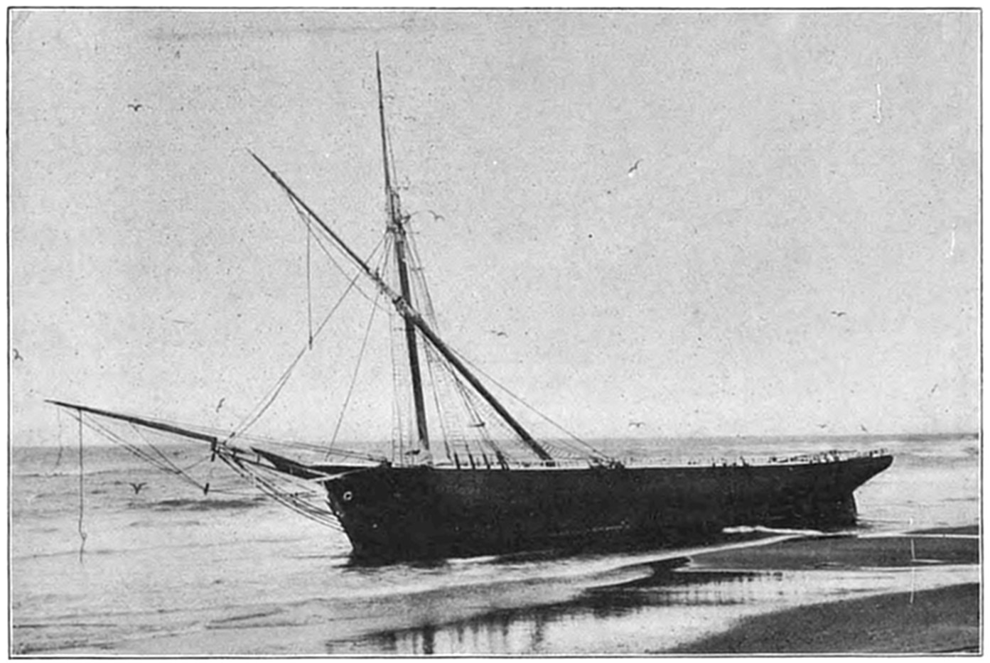 On Sept. 14, 1896, the Italian bark Monte Tabor struck on Peaked Hill Bars during a furious northeast gale. The disaster was attended with the loss of five men, whose deaths were involved in circumstances of mysterious and almost romantic interest. Three were suicides, while the manner in which the other two perished could not be certainly explained. The bark hailed from Genoa, and carried a crew of twelve persons, including the officers and two boys. She had a cargo of salt from Trapani, Island of Sicily, for Boston. The craft had been struck by a hurricane on September 9, and when off Cape Cod on the night of the 13th, in endeavoring to make the harbor at Provincetown,19 she struck the dreaded Peaked Hill Bars. She was discovered by Patrolman Silvey, of the Peaked Hill Bars Station. The night was pitch dark, the surf extremely high, and the bark was soon pounded to pieces. As the life-saving crews could not locate the wreck, there was20 nothing to shoot at and nothing to pull to, even if a boat could have been launched. It is believed that the captain was so humiliated by the loss of his vessel, that he fell into a frenzy of despair, and resolved to take his own life, and it would appear that others of his crew followed his example of self-destruction.