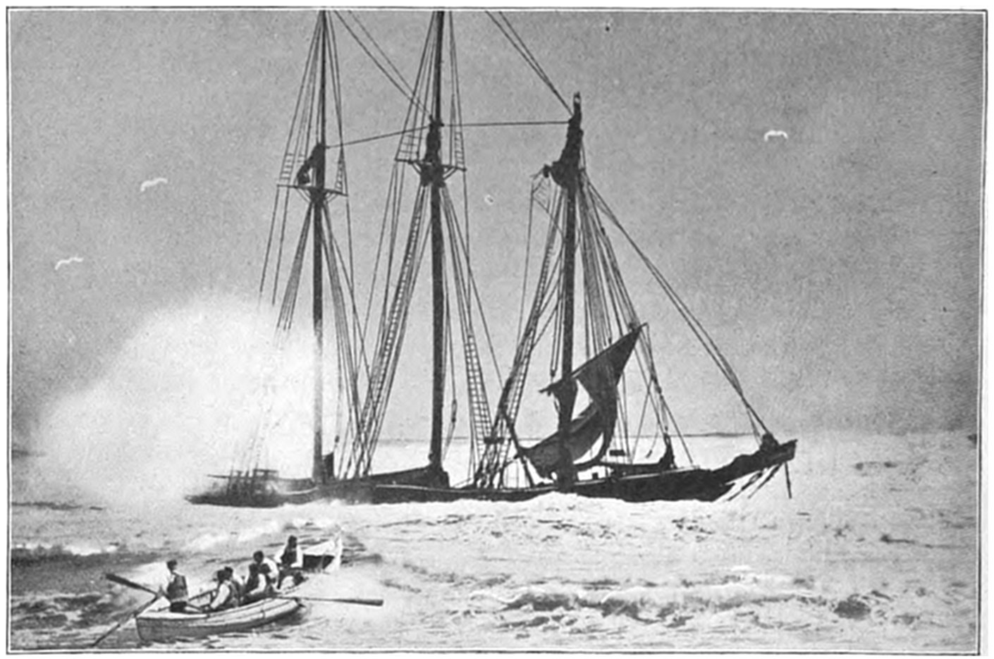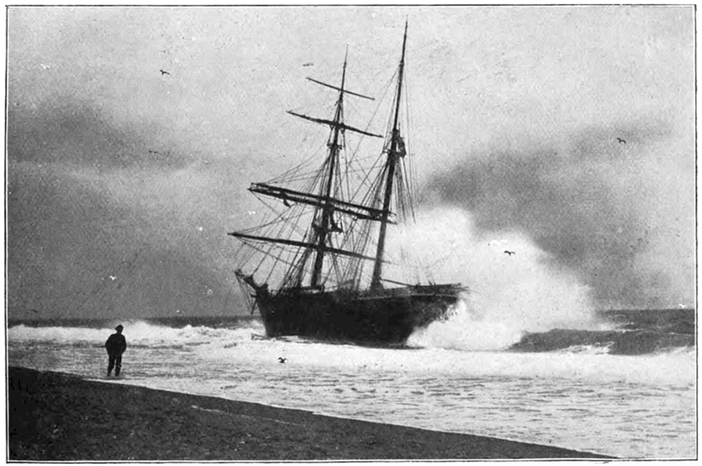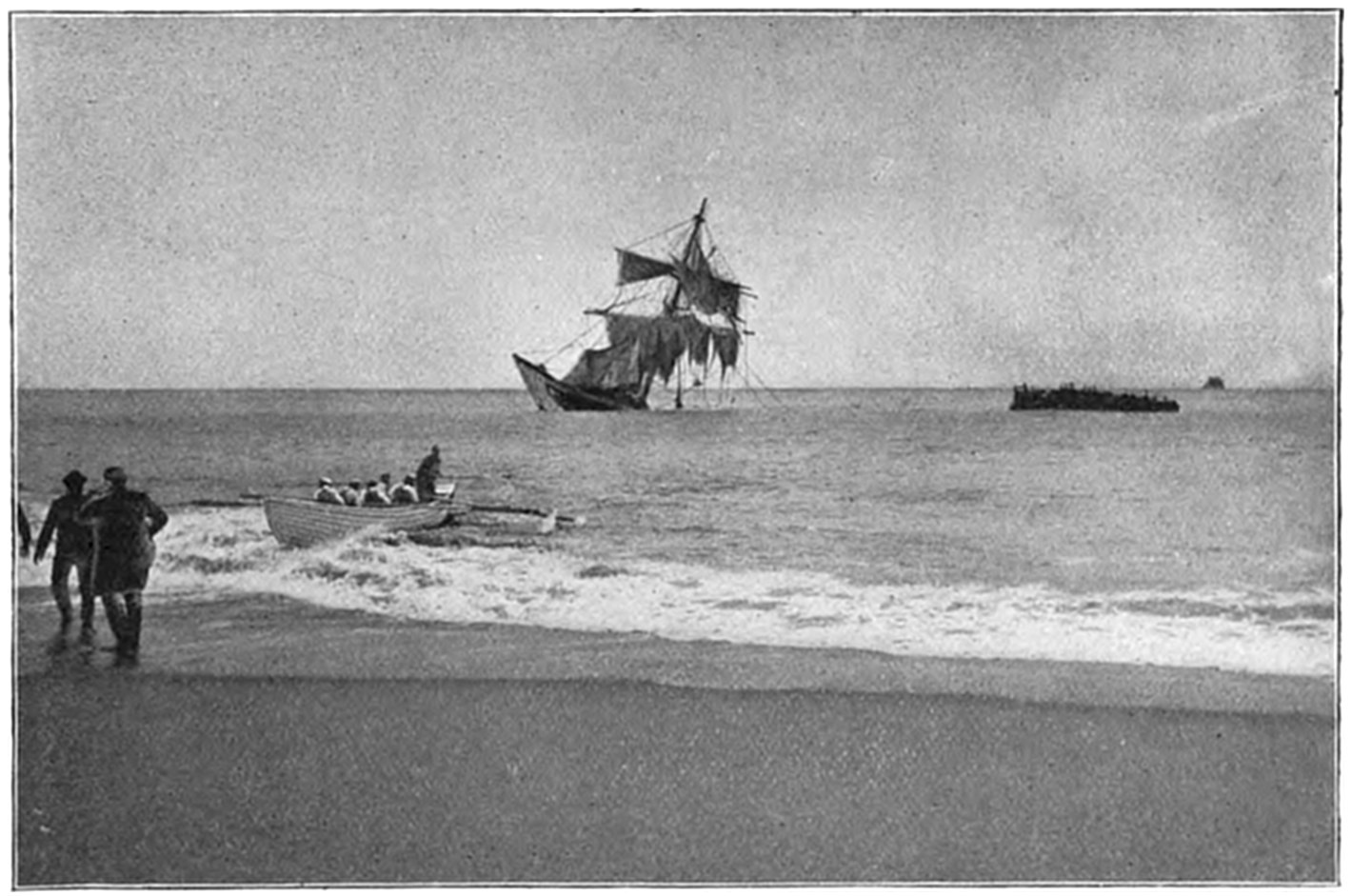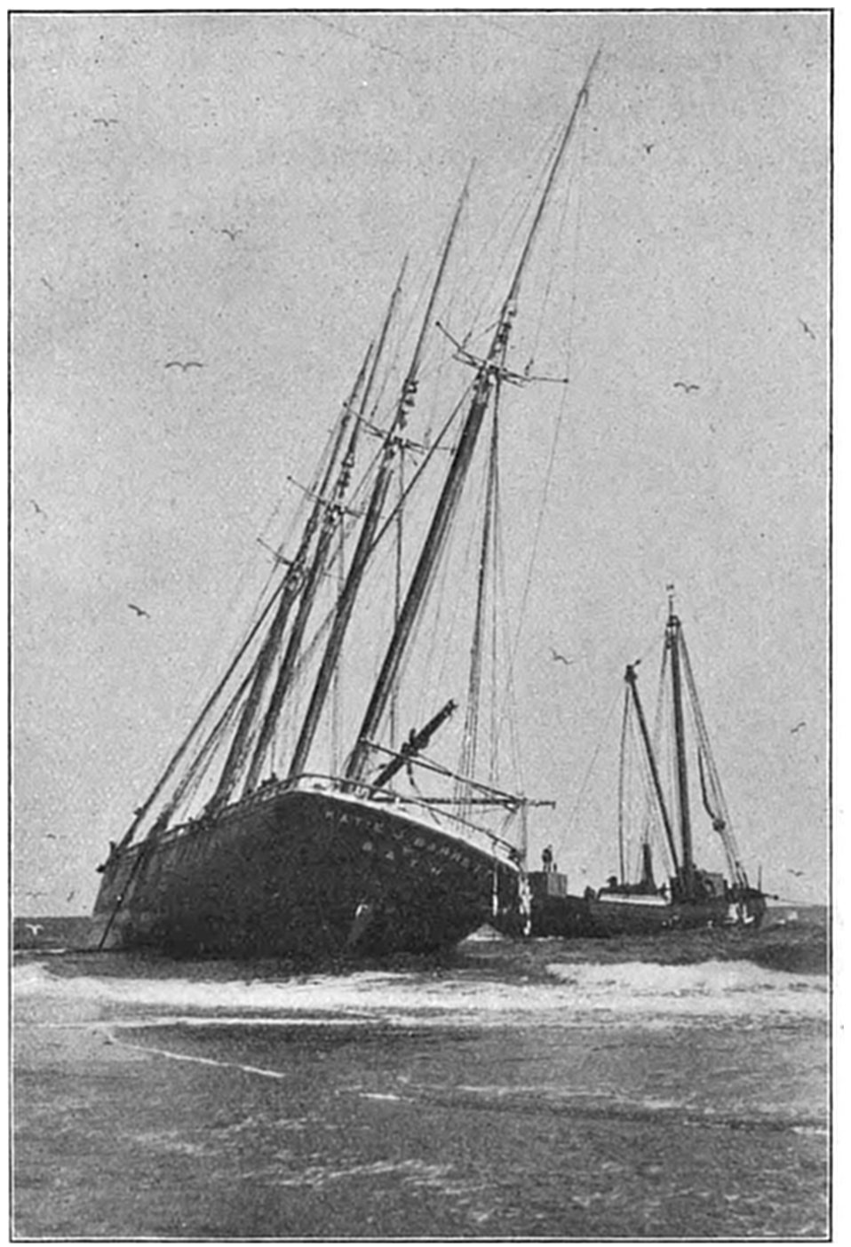 On Sept. 14, 1896, the Italian bark Monte Tabor struck on Peaked Hill Bars during a furious northeast gale. The disaster was attended with the loss of five men, whose deaths were involved in circumstances of mysterious and almost romantic interest. Three were suicides, while the manner in which the other two perished could not be certainly explained. The bark hailed from Genoa, and carried a crew of twelve persons, including the officers and two boys. She had a cargo of salt from Trapani, Island of Sicily, for Boston. The craft had been struck by a hurricane on September 9, and when off Cape Cod on the night of the 13th, in endeavoring to make the harbor at Provincetown,19 she struck the dreaded Peaked Hill Bars. She was discovered by Patrolman Silvey, of the Peaked Hill Bars Station. The night was pitch dark, the surf extremely high, and the bark was soon pounded to pieces. As the life-saving crews could not locate the wreck, there was20 nothing to shoot at and nothing to pull to, even if a boat could have been launched. It is believed that the captain was so humiliated by the loss of his vessel, that he fell into a frenzy of despair, and resolved to take his own life, and it would appear that others of his crew followed his example of self-destruction.
