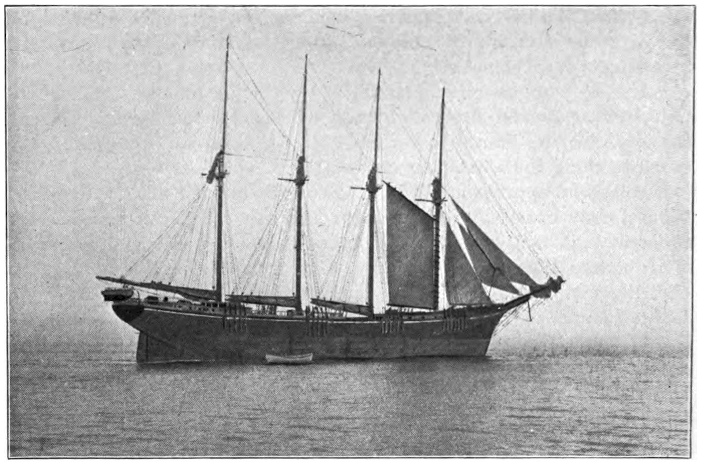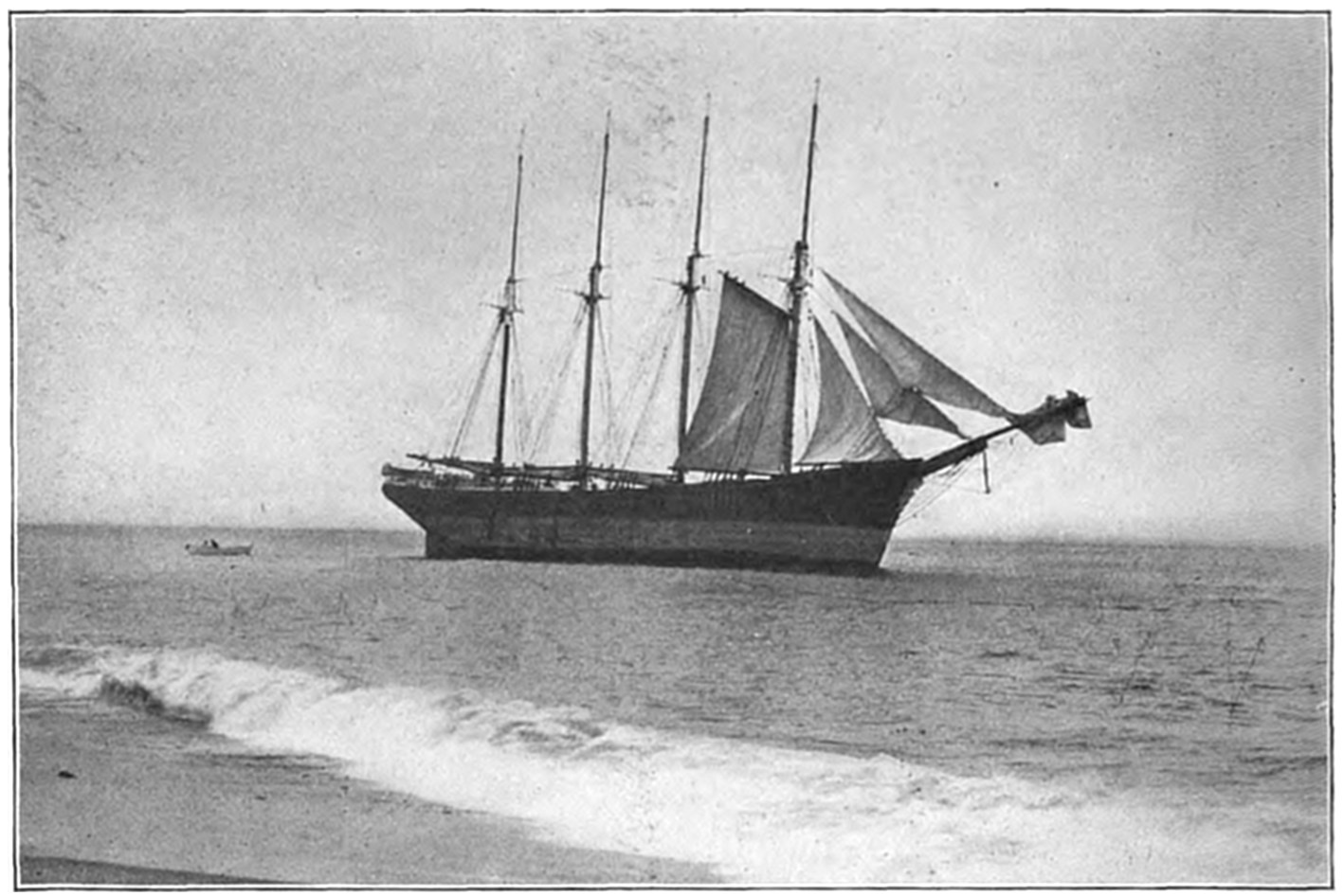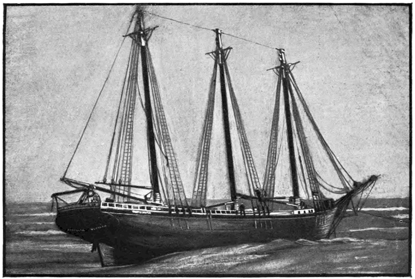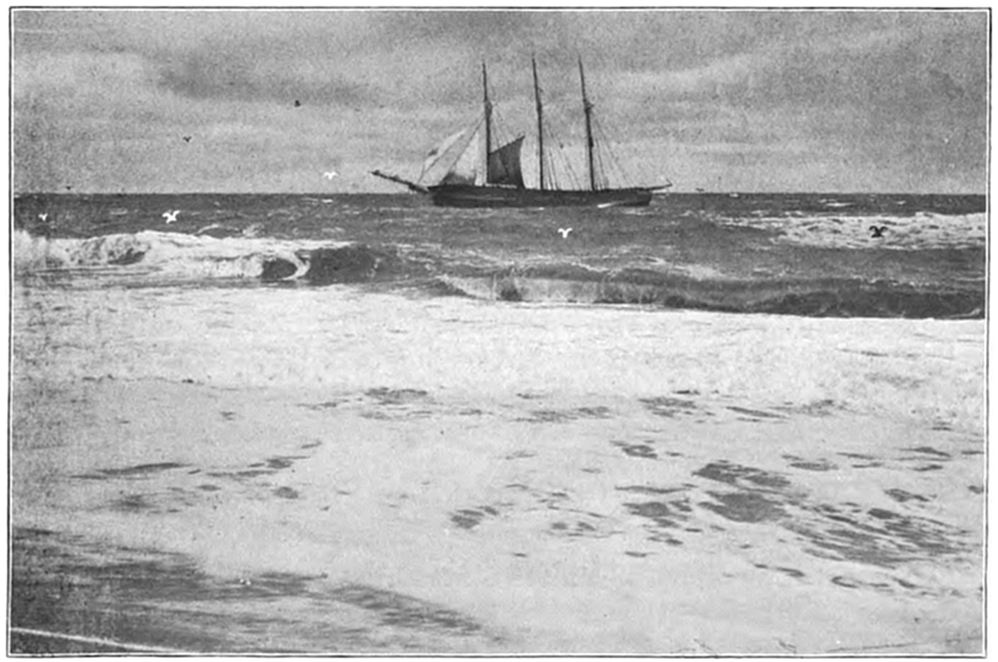 On Sept. 14, 1896, the Italian bark Monte Tabor struck on Peaked Hill Bars during a furious northeast gale. The disaster was attended with the loss of five men, whose deaths were involved in circumstances of mysterious and almost romantic interest. Three were suicides, while the manner in which the other two perished could not be certainly explained. The bark hailed from Genoa, and carried a crew of twelve persons, including the officers and two boys. She had a cargo of salt from Trapani, Island of Sicily, for Boston. The craft had been struck by a hurricane on September 9, and when off Cape Cod on the night of the 13th, in endeavoring to make the harbor at Provincetown,19 she struck the dreaded Peaked Hill Bars. She was discovered by Patrolman Silvey, of the Peaked Hill Bars Station. The night was pitch dark, the surf extremely high, and the bark was soon pounded to pieces. As the life-saving crews could not locate the wreck, there was20 nothing to shoot at and nothing to pull to, even if a boat could have been launched. It is believed that the captain was so humiliated by the loss of his vessel, that he fell into a frenzy of despair, and resolved to take his own life, and it would appear that others of his crew followed his example of self-destruction.