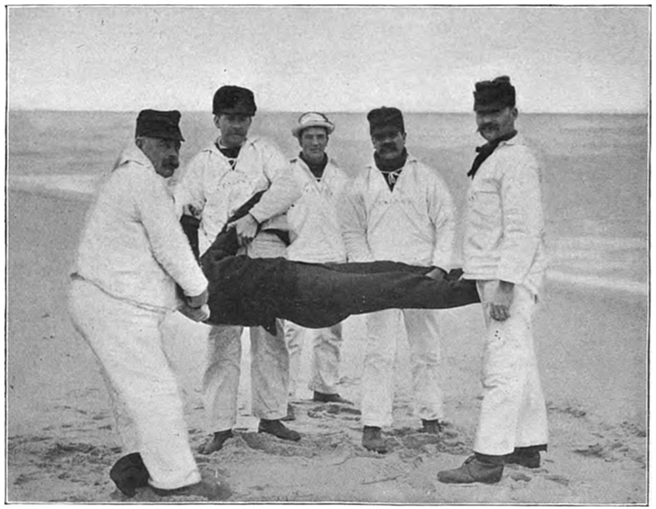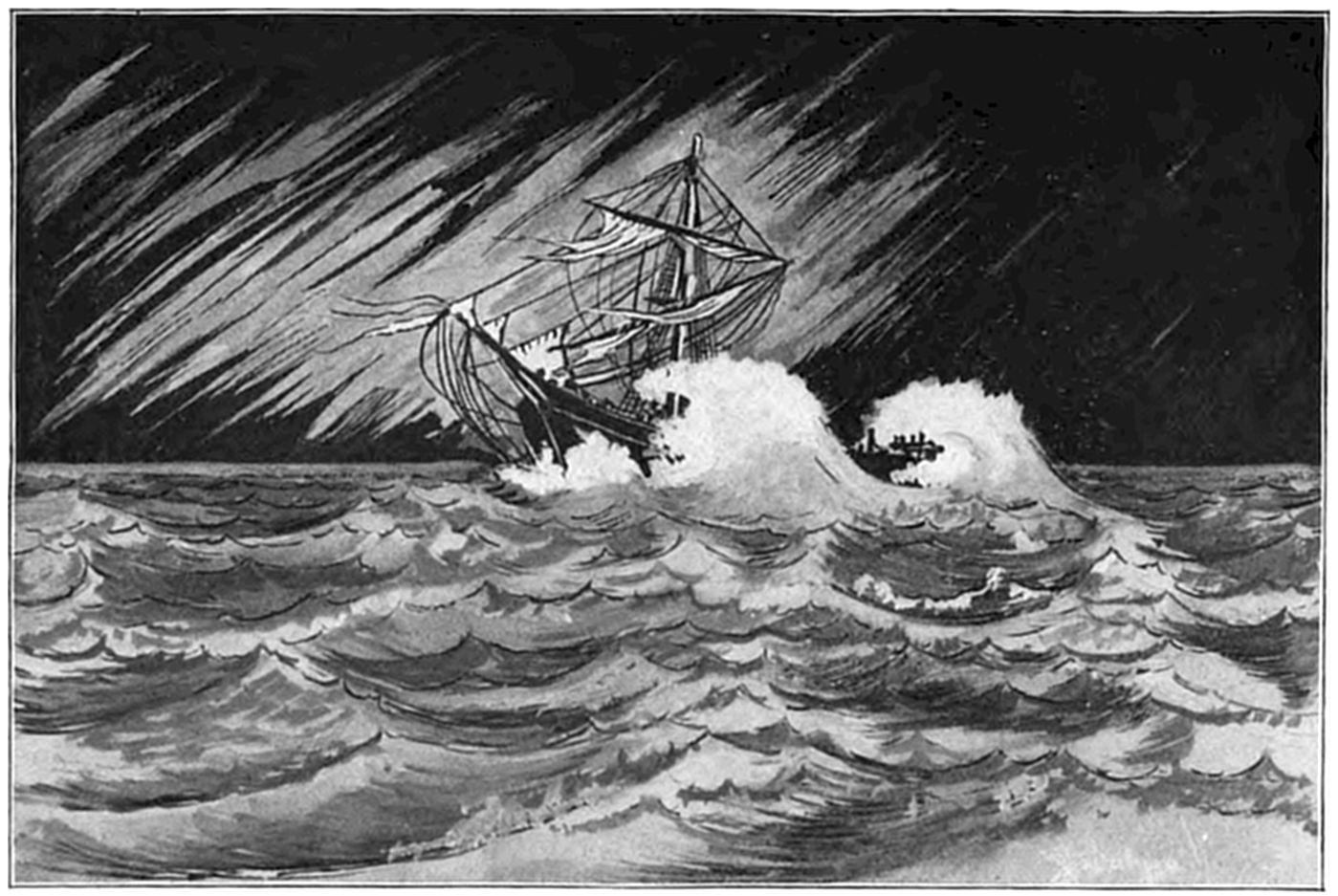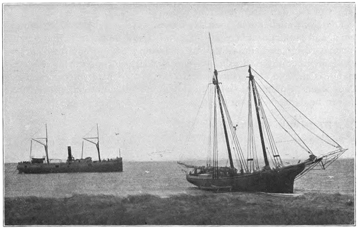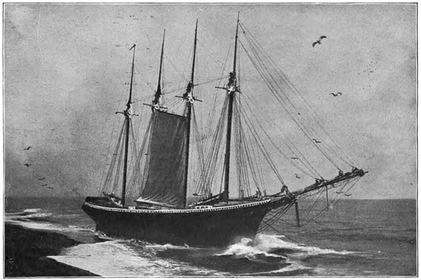 On Sept. 14, 1896, the Italian bark Monte Tabor struck on Peaked Hill Bars during a furious northeast gale. The disaster was attended with the loss of five men, whose deaths were involved in circumstances of mysterious and almost romantic interest. Three were suicides, while the manner in which the other two perished could not be certainly explained. The bark hailed from Genoa, and carried a crew of twelve persons, including the officers and two boys. She had a cargo of salt from Trapani, Island of Sicily, for Boston. The craft had been struck by a hurricane on September 9, and when off Cape Cod on the night of the 13th, in endeavoring to make the harbor at Provincetown,19 she struck the dreaded Peaked Hill Bars. She was discovered by Patrolman Silvey, of the Peaked Hill Bars Station. The night was pitch dark, the surf extremely high, and the bark was soon pounded to pieces. As the life-saving crews could not locate the wreck, there was20 nothing to shoot at and nothing to pull to, even if a boat could have been launched. It is believed that the captain was so humiliated by the loss of his vessel, that he fell into a frenzy of despair, and resolved to take his own life, and it would appear that others of his crew followed his example of self-destruction.
