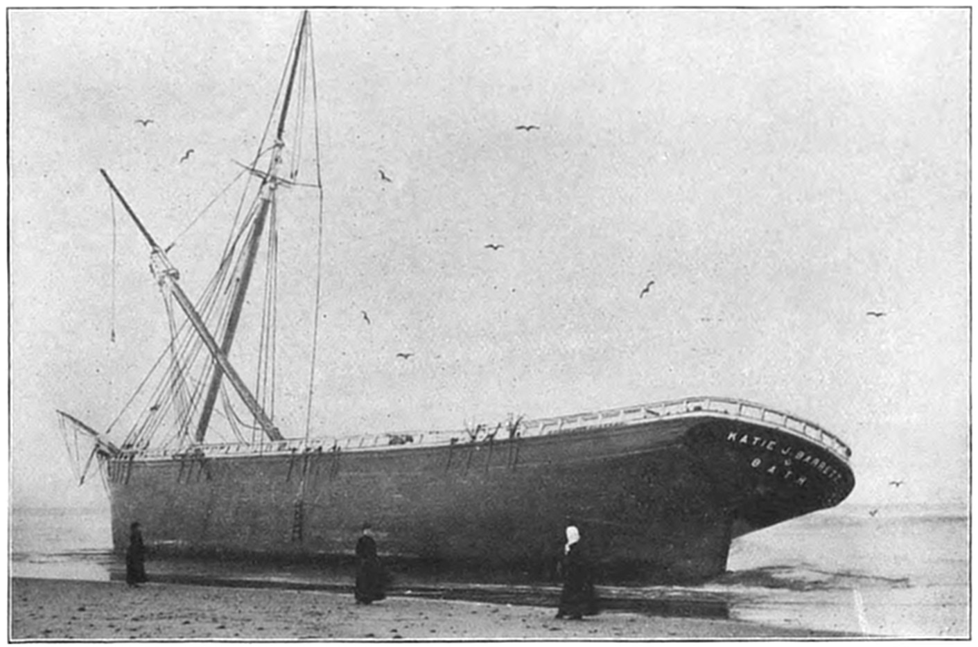 The schooner Daniel B. Fearing, which became a total loss on the bars off Cahoon’s Hollow Station, struck there during a fog on May 6, 1896. The life savers put off to the wreck in their surf-boat, and brought the crew ashore. A gale sprung up with great suddenness as the crew were leaving the doomed vessel, and as the last man jumped into the life-boat the masts of the big schooner fell with a crash, and the sea soon completed the work of total destruction.