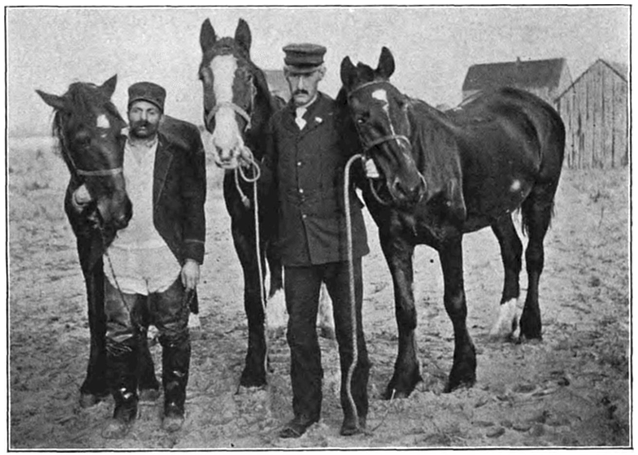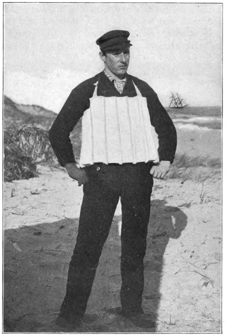 The life savers along the shore at Nauset first saw the Jason, and word that a ship was in dangerous proximity to the shore was sent along the Cape to all the stations. The Jason was last seen just before five o’clock by the day patrol of the Nauset Station. The life savers, knowing that she could hardly weather the Cape, kept a sharp lookout for her, and at all the stations the horses were hitched into the beach carts and every preparation made to go to the assistance of the ship without a moment’s delay. It was a fearful night along the shores of Cape Cod, the coast guardians having all they could do to go over their patrol. Nothing was seen or heard of the doomed ship15 up to seven o’clock in the evening, and the life savers hoped that she had managed to work offshore or around the Cape. At half-past seven, however, Surfman Honey, of the Pamet River Station, burst into the station, and shouted, “Hopkins (the north patrol) has just burned his signal.” A moment later Hopkins rushed into the station and reported that the Jason had struck on the bars about a half mile north of the station. Keeper Rich and his crew were ready for the emergency, and, with the beach cart, rushed to the scene. The shore was then piled with wreckage, and the slatting of the sails of the wrecked ship sounded above the roar and din of the storm. A careful lookout for the shipwrecked seafarers was kept by the life savers as they hurried to the scene, and Evans, the sole survivor of the disaster, was found clinging to a bale of jute. He was clad only in his underclothes, and was almost totally helpless.