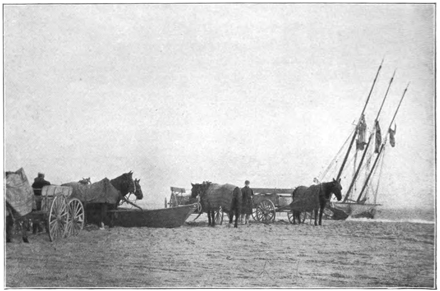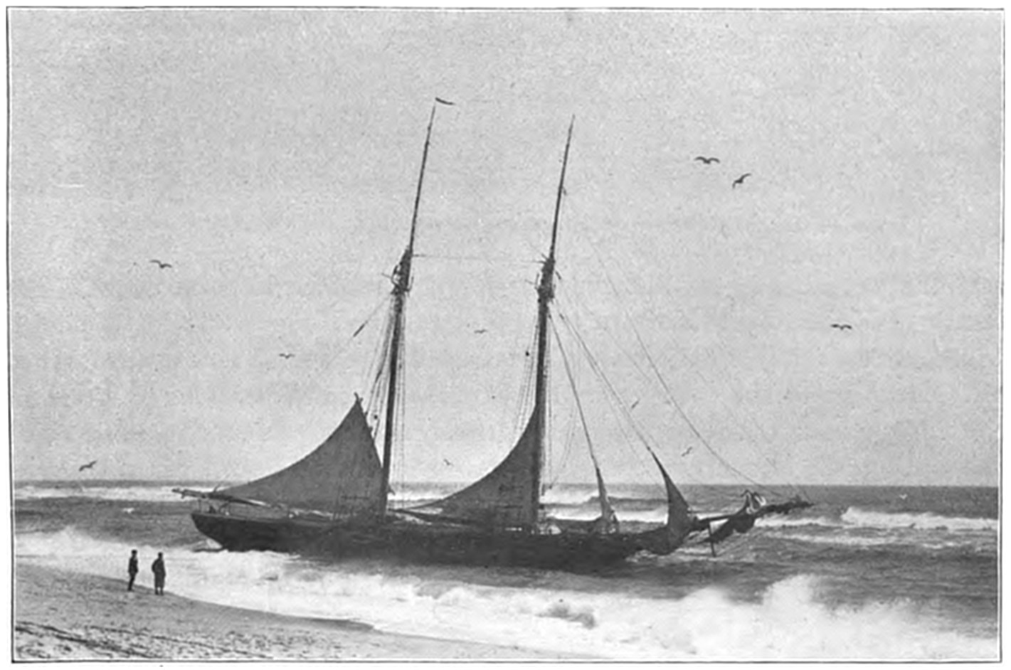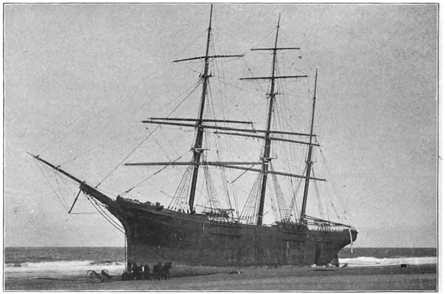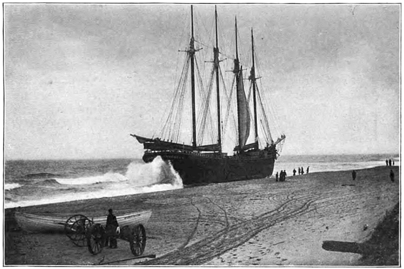 The schooner Job H. Jackson was another terrible wreck that occurred on Peaked Hill Bars. The schooner struck on Jan. 5, 1895,18 during bitter cold weather, and the crew were driven into the rigging. A fearful sea was pounding on the shore, and it required the combined herculean efforts of the Peaked Hill Bars, Race Point, and High Head life-saving crews, with their life-boats, to rescue the imperiled seafarers, who were badly frost-bitten and helpless when taken from the wrecked vessel.