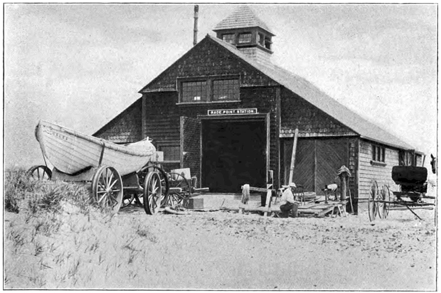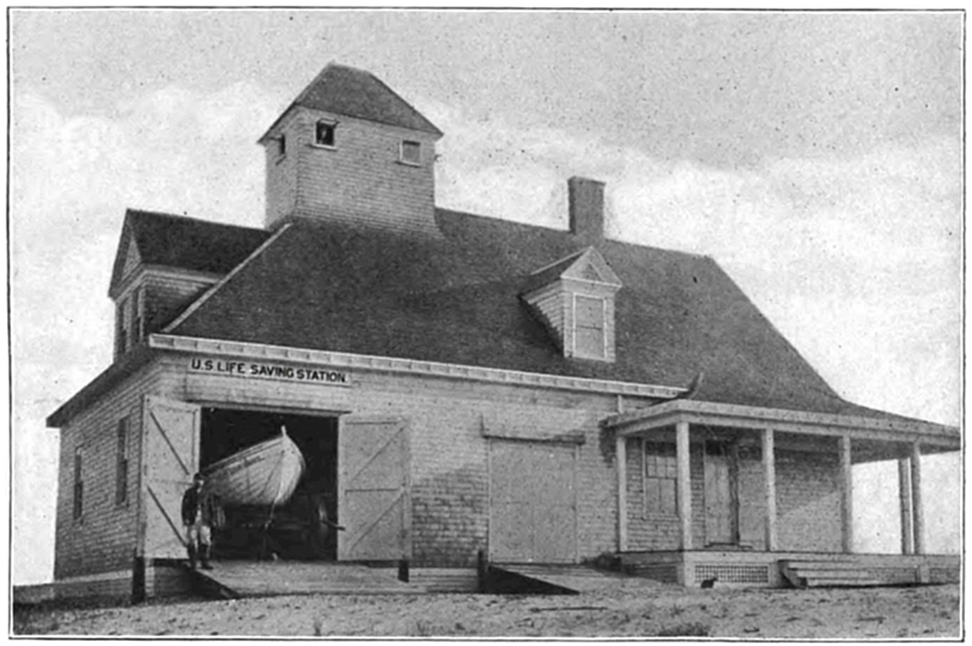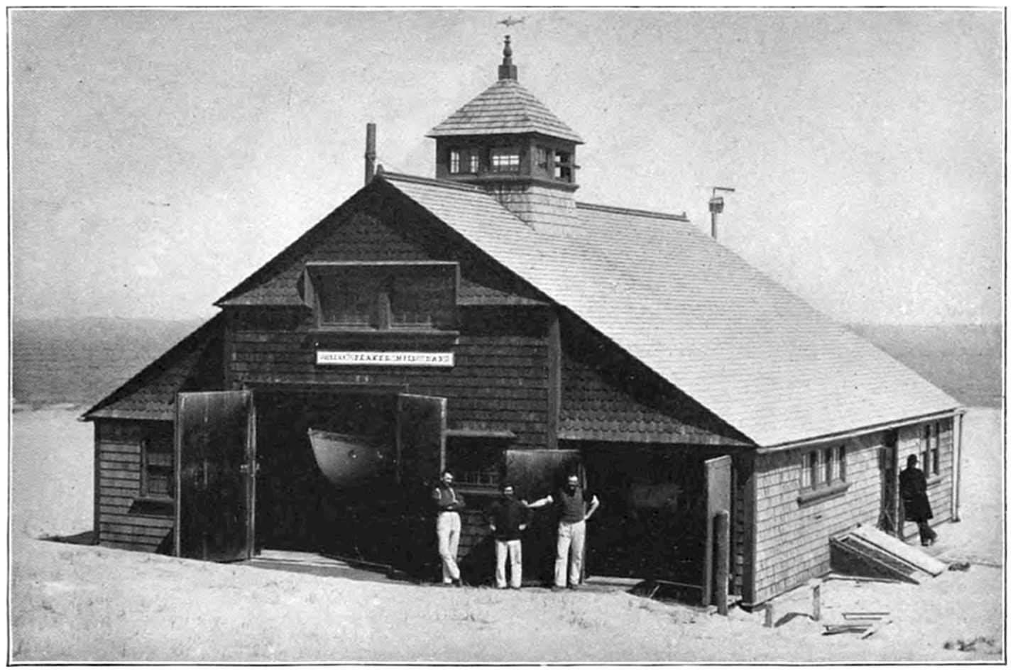 The Society first began its work of rendering assistance to shipwrecked mariners by building huts on many of the desolate sections of the coast. These huts were for the shelter of shipwrecked persons who might reach the shore. The first building of this kind was erected on Lovell’s Island in Boston Harbor in 1807. Later, the Society established the first life-boat station at Cohasset, subsequently erecting others along the coast, and extending its good work to the shores of Cape Cod.