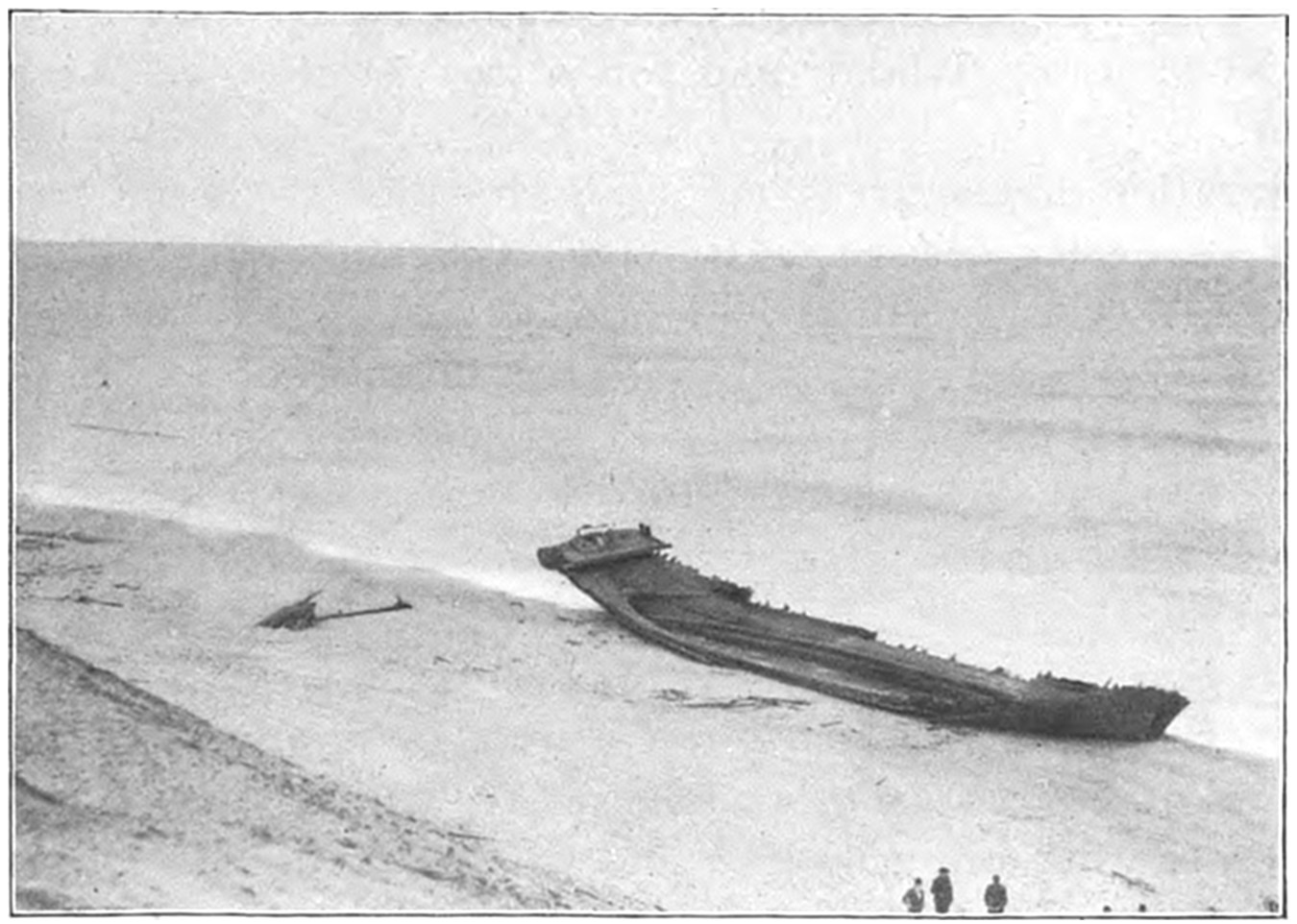 Another historic wreck was that of the pirate ship Widdah, which was lost near the site of the Cahoon’s Hollow Life-Saving Station in 1718. The ship was commanded by Captain Bellamy, and carried twenty-three guns and a crew of one hundred and thirty men. Captain Bellamy had captured seven vessels off the shores of Cape Cod, and on one of them had placed seven of his crew. The captain of the captured ship ran his vessel close to the shore, and the seven pirates were taken prisoners. Later six of them were executed in Boston. The Widdah soon after was driven ashore during a gale, and all hands, save an Englishman and an Indian, were lost.