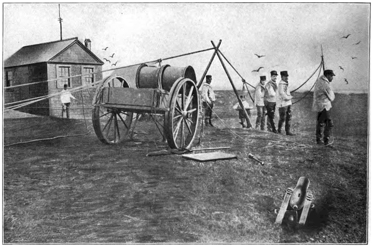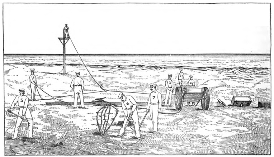 In 1845, a few years before Congress took steps for providing means for rendering assistance to wrecked vessels along the coasts of the United States, the Society had eighteen stations on the Massachusetts coast, with boats and mortars for throwing life lines to stranded vessels, in addition to numerous huts of refuge.