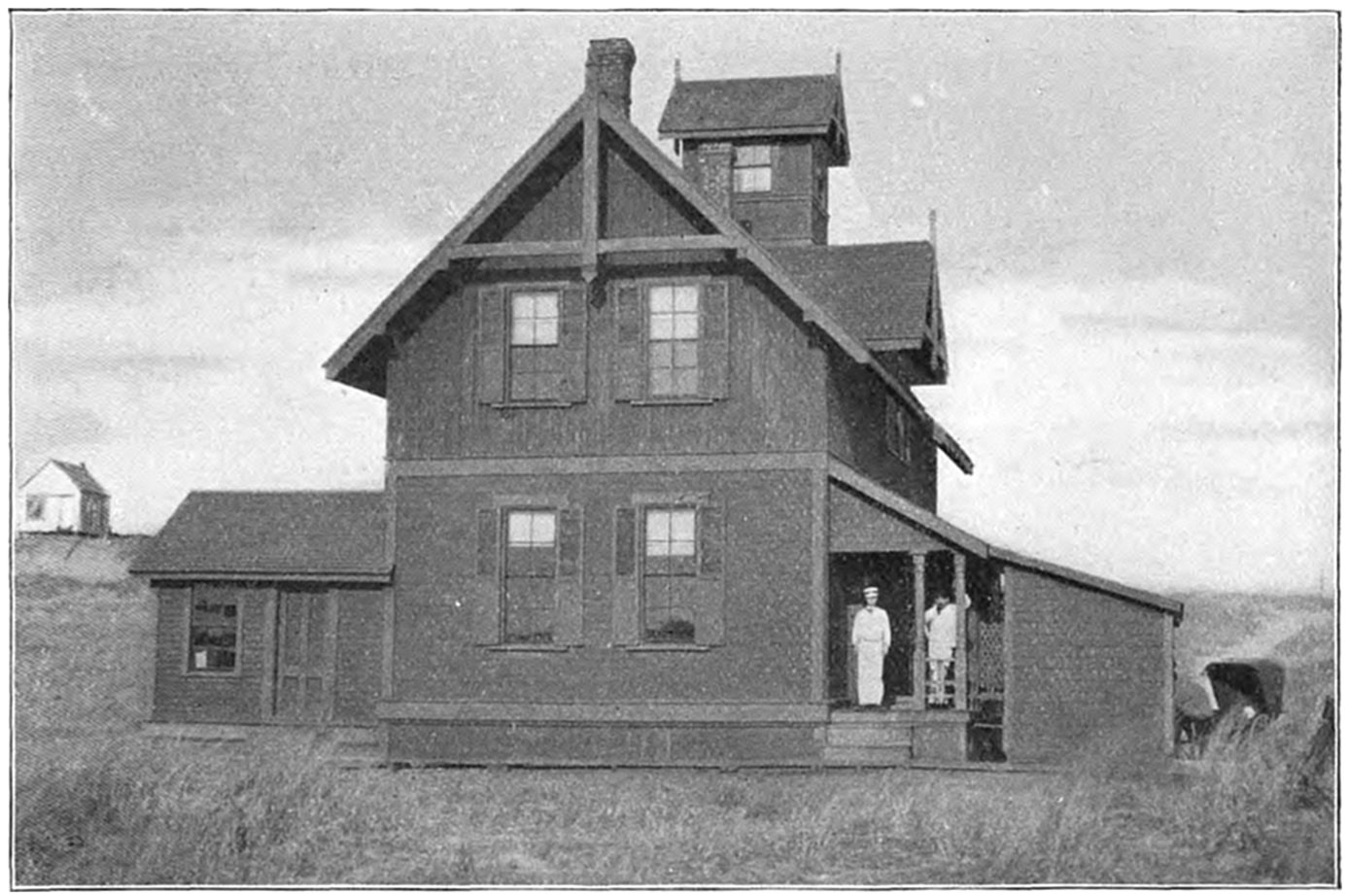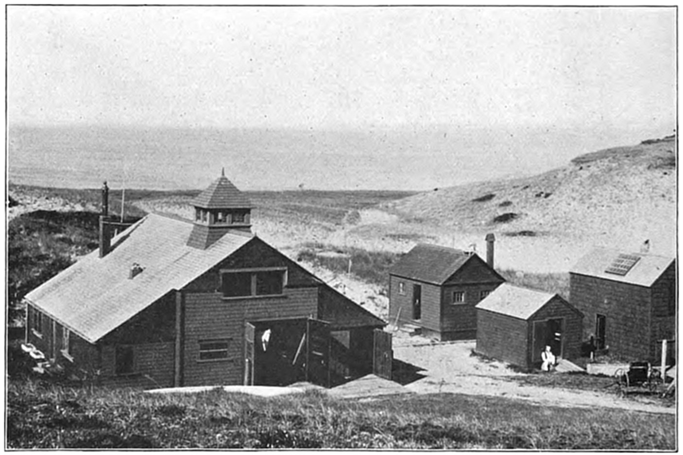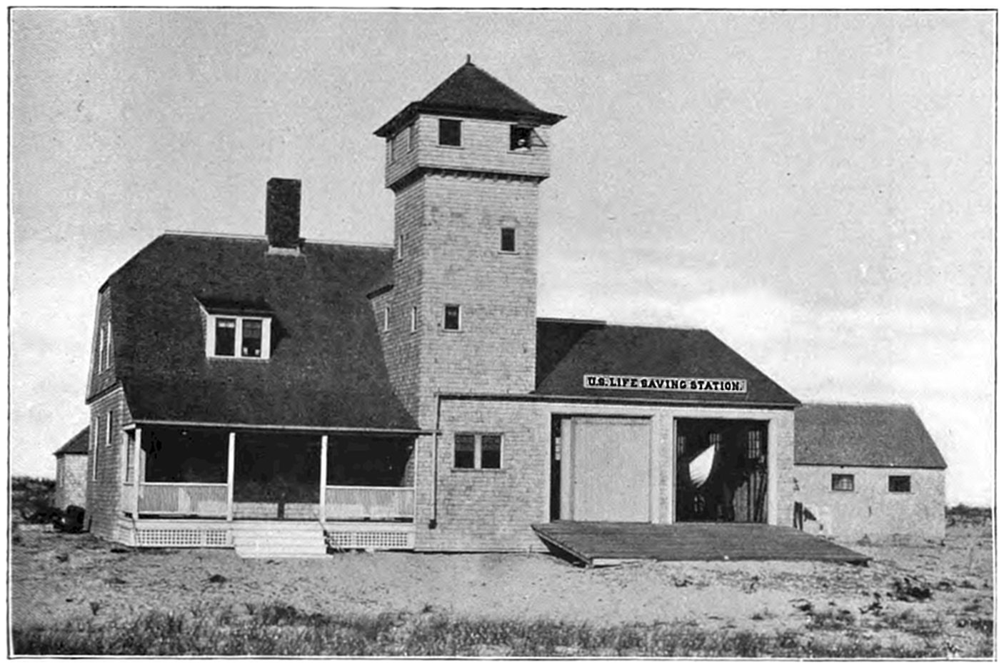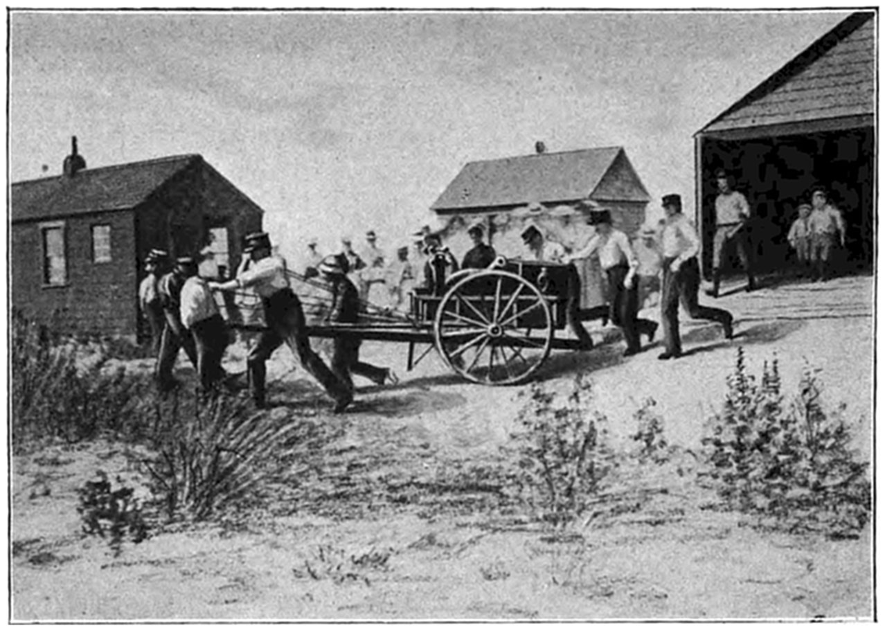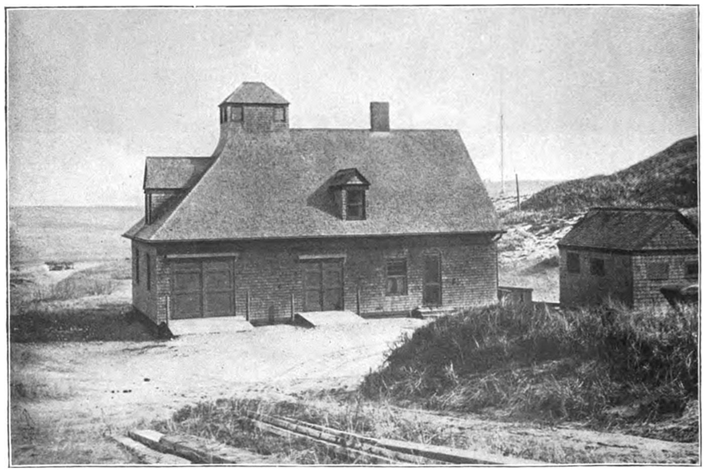 The establishment of the United States Life-Saving Service on Cape Cod dates back but thirty years, which time also marks the reorganization, extension, and beginning of its efficiency in the United States. While as early as 1797 the town of Truro sold to the United States23 Government a tract of land upon which to erect the first lighthouse on Cape Cod,—Highland Light, so called,—it was not until half a century later that the government began to provide means for the relief of mariners wrecked upon its coasts, and seventy-five years afterwards that the first United States Life-Saving Station was erected on the shores of Cape Cod.