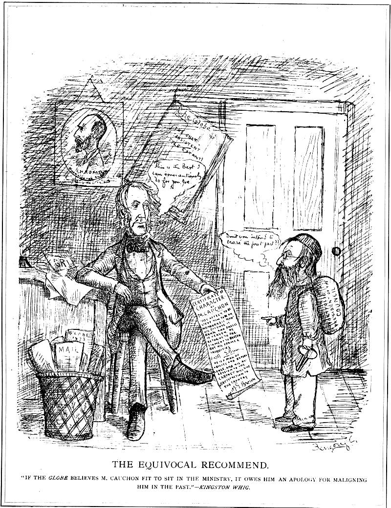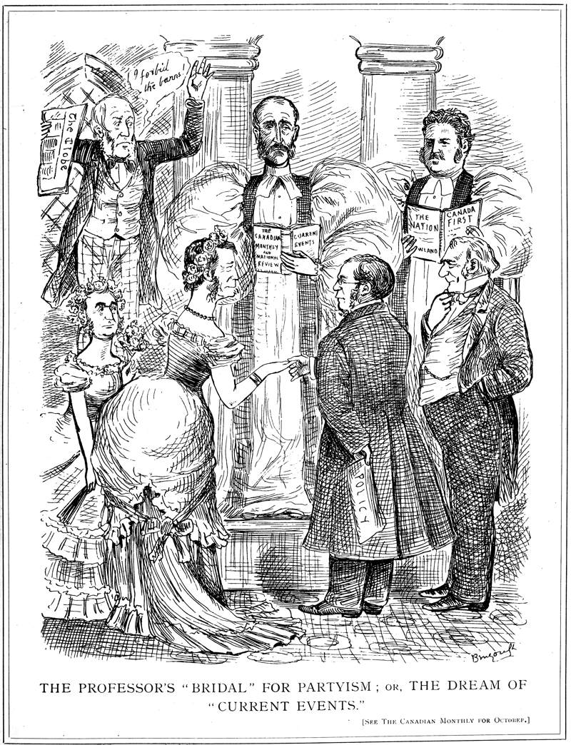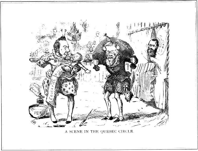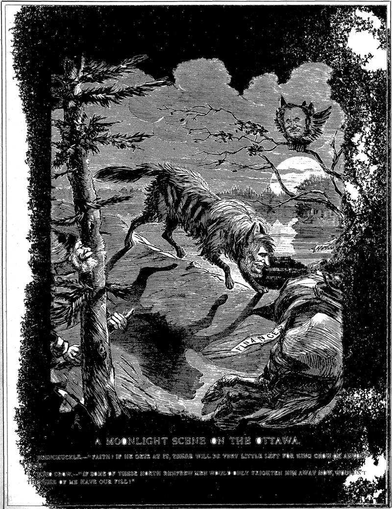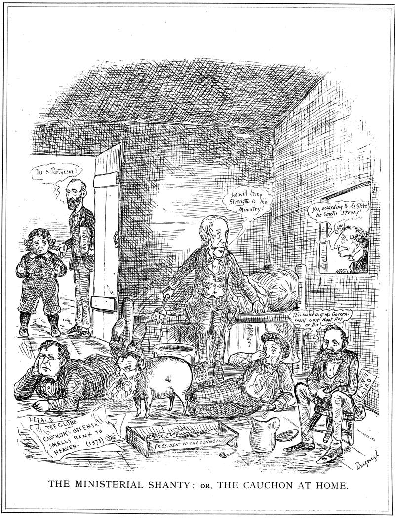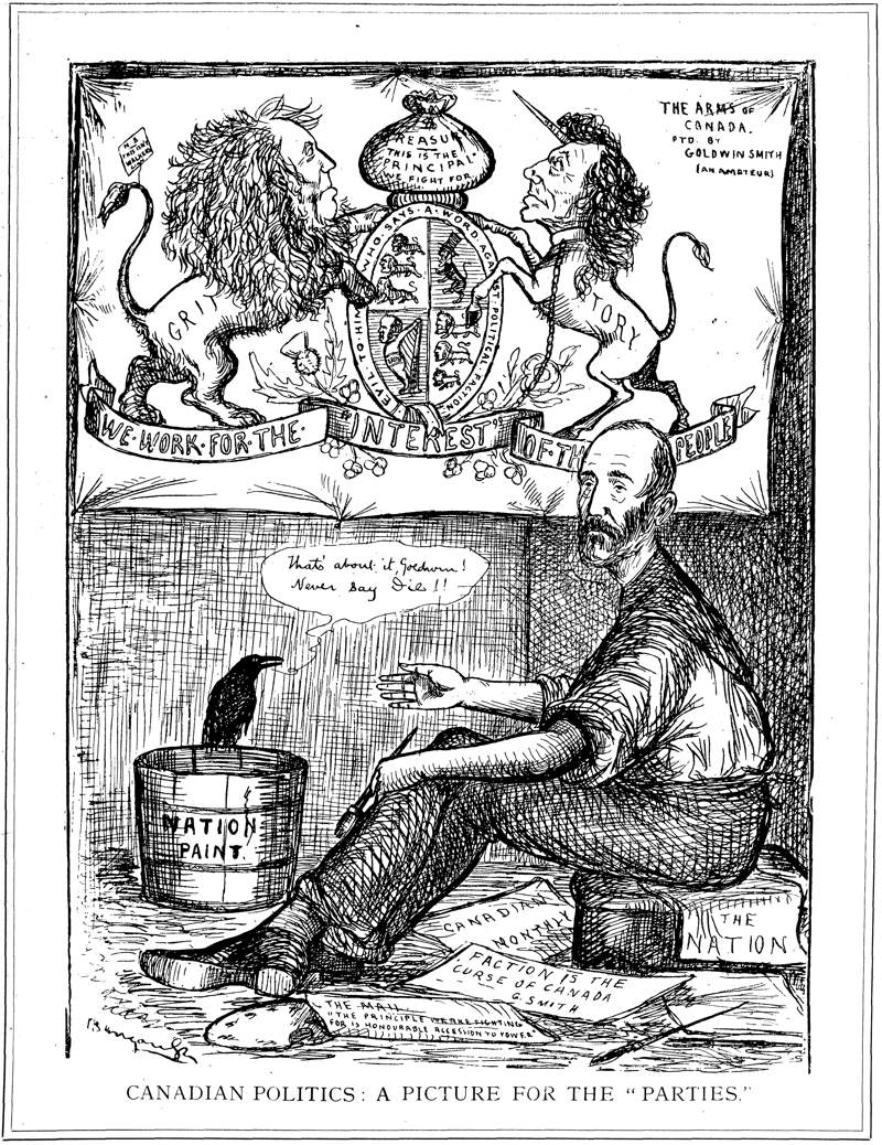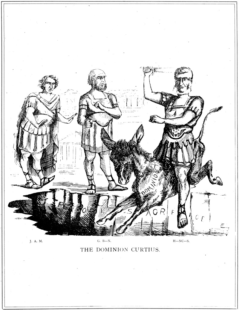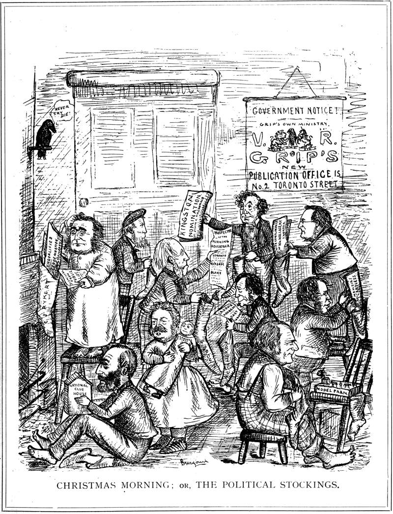 A “caricature history” does not mean that history is caricatured. On the contrary, a good caricature enables us to see, in a true light, facts that might otherwise be hidden or misrepresented. We understand current events and the social life of England from the illustrations of Punch more truly than from the columns of the Times or the Morning Post. Canada is only beginning life, and our politics touch subjects of general interest so seldom, that it is sometimes thought and said that there is no field for a Canadian Punch; but the fact, perhaps not generally known, that for the last forty years, at any rate, we have rarely been without artists whose pictures on the questions of the day have appealed successfully to popular humor, proves that our political life has been robust from the beginning. Some of these artists had to content themselves with publishing fly-sheets that provoked the laughter of the town, but that had no chance of obtaining more than a local reputation. For others, organs well-known in their day, such as Punch in Canada, Diogenes, and Grinchuckle, were established at different times prior to 1873, when Grip vaulted into the seat which he has occupied since to the satisfaction of all Canada. Requests have been frequently made for a work containing a continuous series of his cartoons, and in now acceding to these it has been thought well to give illustrations of what was done among us in the same line previously. Fortunately the publishers were able to obtain selections from the sources to which I have referred, and also from the Canadian Illustrated News; and the First Volume of this work thus gives something like a continuous pictorial history of the events that have stirred popular feeling most deeply since 1848. They believe that those older representations will be heartily welcomed, and they desire to thank all who have assisted in making the work so extended.