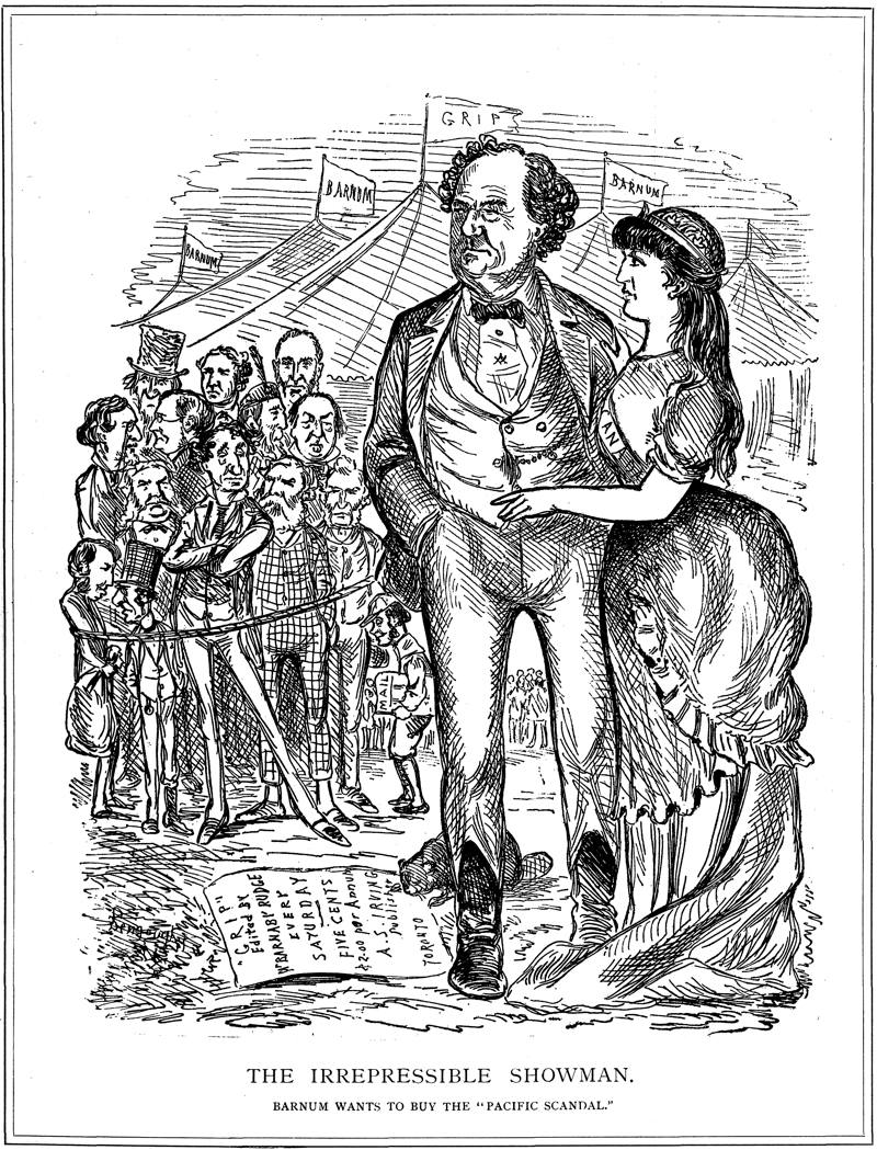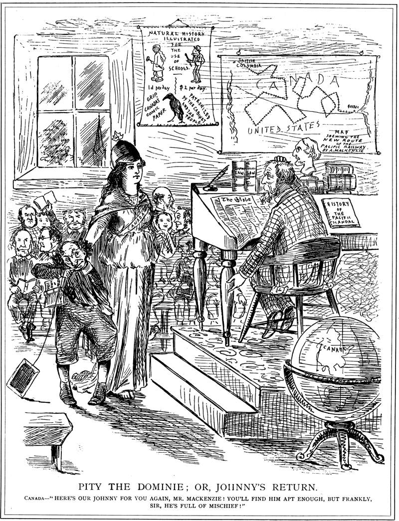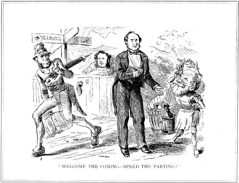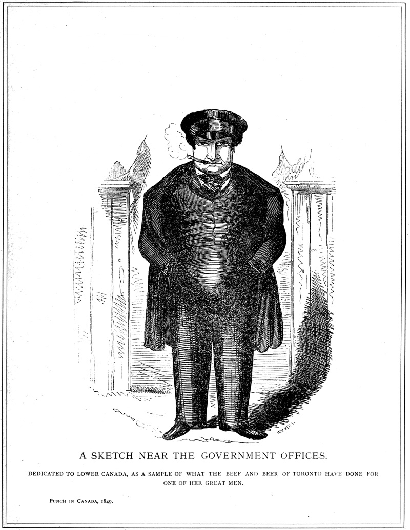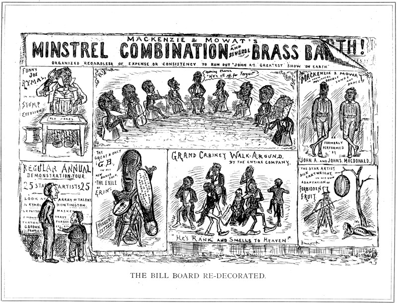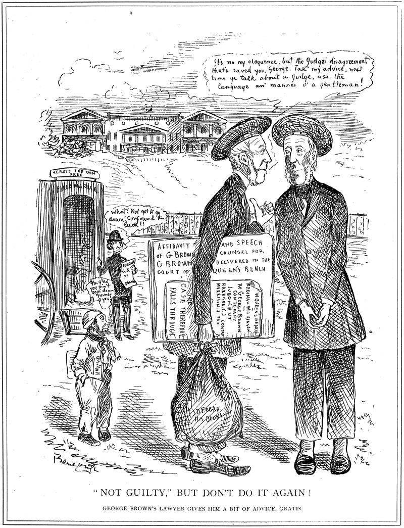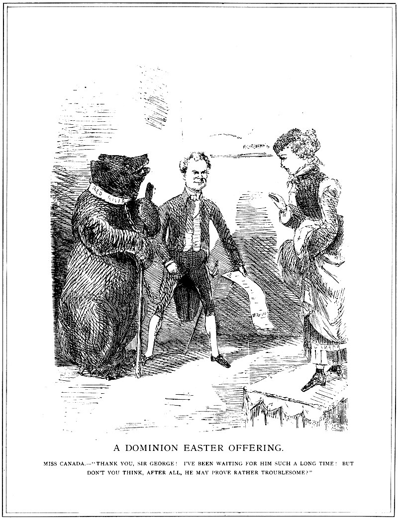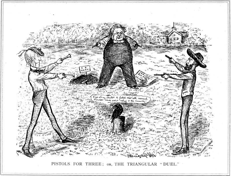A “caricature history” does not mean that history is caricatured. On the contrary, a good caricature enables us to see, in a true light, facts that might otherwise be hidden or misrepresented. We understand current events and the social life of England from the illustrations of Punch more truly than from the columns of the Times or the Morning Post. Canada is only beginning life, and our politics touch subjects of general interest so seldom, that it is sometimes thought and said that there is no field for a Canadian Punch; but the fact, perhaps not generally known, that for the last forty years, at any rate, we have rarely been without artists whose pictures on the questions of the day have appealed successfully to popular humor, proves that our political life has been robust from the beginning. Some of these artists had to content themselves with publishing fly-sheets that provoked the laughter of the town, but that had no chance of obtaining more than a local reputation. For others, organs well-known in their day, such as Punch in Canada, Diogenes, and Grinchuckle, were established at different times prior to 1873, when Grip vaulted into the seat which he has occupied since to the satisfaction of all Canada. Requests have been frequently made for a work containing a continuous series of his cartoons, and in now acceding to these it has been thought well to give illustrations of what was done among us in the same line previously. Fortunately the publishers were able to obtain selections from the sources to which I have referred, and also from the Canadian Illustrated News; and the First Volume of this work thus gives something like a continuous pictorial history of the events that have stirred popular feeling most deeply since 1848. They believe that those older representations will be heartily welcomed, and they desire to thank all who have assisted in making the work so extended.
