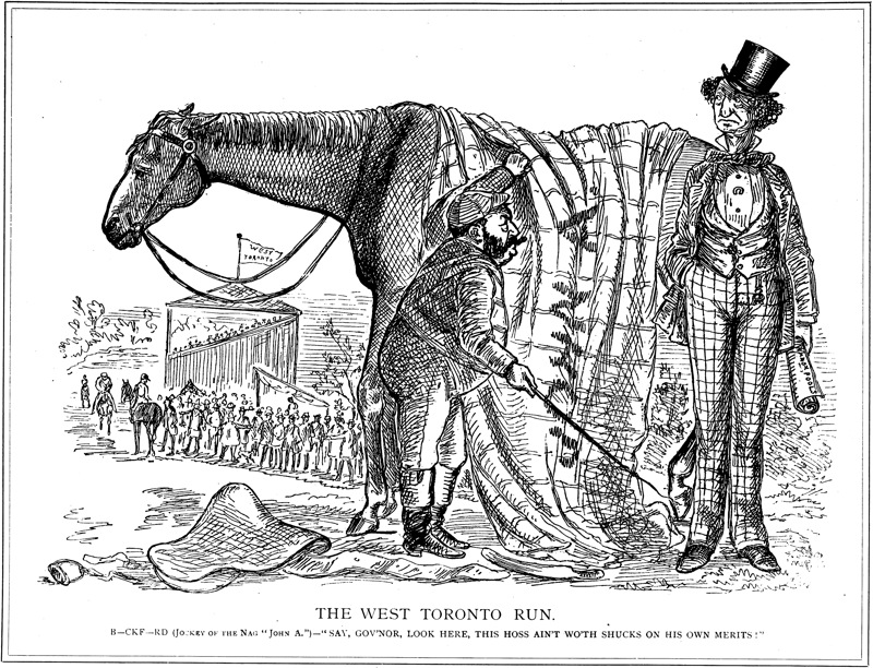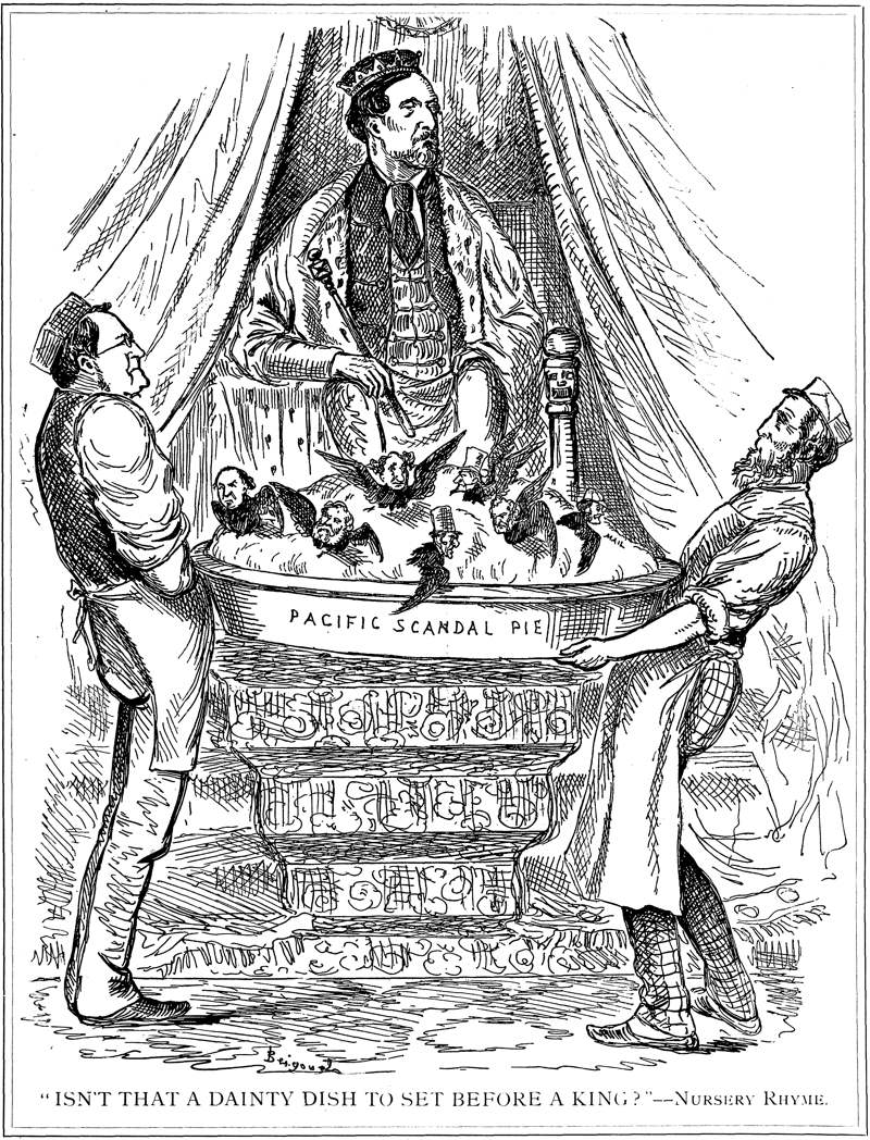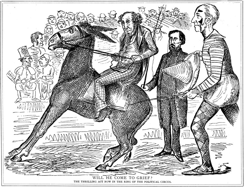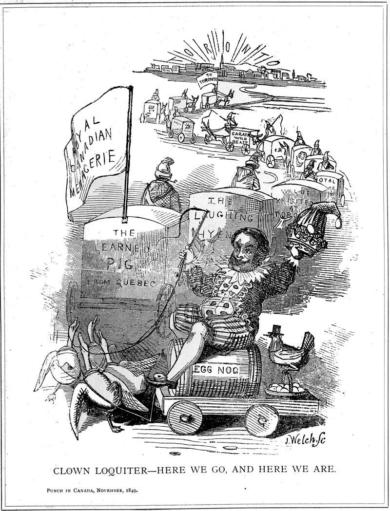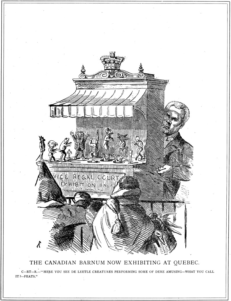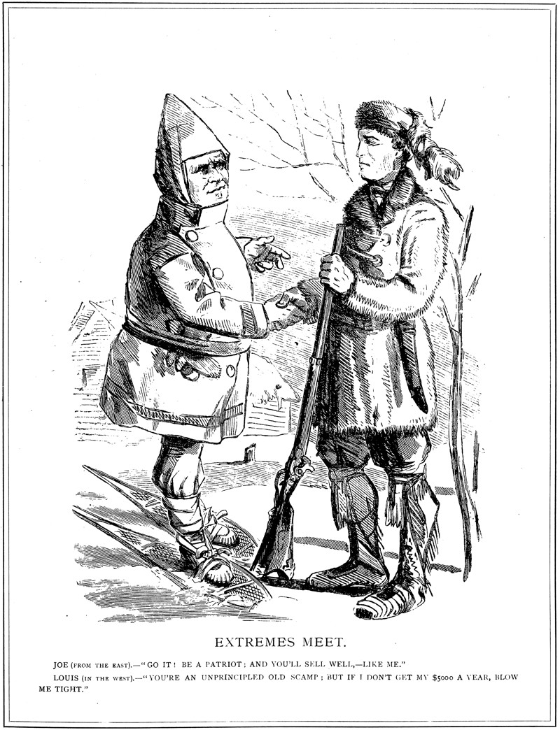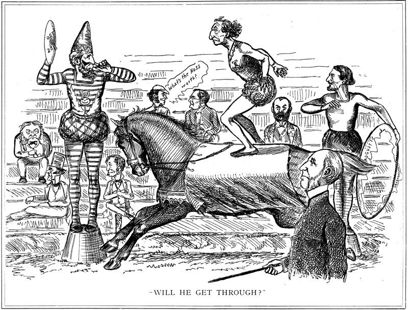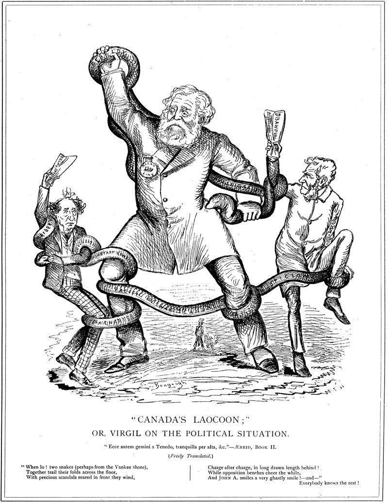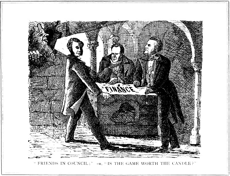A “caricature history” does not mean that history is caricatured. On the contrary, a good caricature enables us to see, in a true light, facts that might otherwise be hidden or misrepresented. We understand current events and the social life of England from the illustrations of Punch more truly than from the columns of the Times or the Morning Post. Canada is only beginning life, and our politics touch subjects of general interest so seldom, that it is sometimes thought and said that there is no field for a Canadian Punch; but the fact, perhaps not generally known, that for the last forty years, at any rate, we have rarely been without artists whose pictures on the questions of the day have appealed successfully to popular humor, proves that our political life has been robust from the beginning. Some of these artists had to content themselves with publishing fly-sheets that provoked the laughter of the town, but that had no chance of obtaining more than a local reputation. For others, organs well-known in their day, such as Punch in Canada, Diogenes, and Grinchuckle, were established at different times prior to 1873, when Grip vaulted into the seat which he has occupied since to the satisfaction of all Canada. Requests have been frequently made for a work containing a continuous series of his cartoons, and in now acceding to these it has been thought well to give illustrations of what was done among us in the same line previously. Fortunately the publishers were able to obtain selections from the sources to which I have referred, and also from the Canadian Illustrated News; and the First Volume of this work thus gives something like a continuous pictorial history of the events that have stirred popular feeling most deeply since 1848. They believe that those older representations will be heartily welcomed, and they desire to thank all who have assisted in making the work so extended.