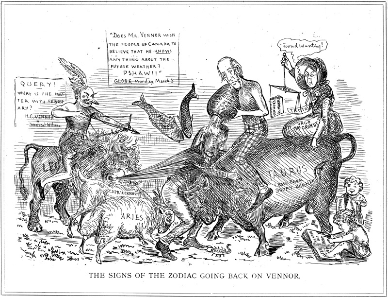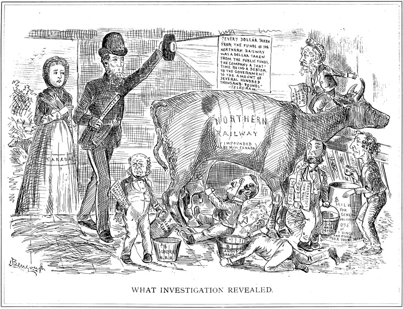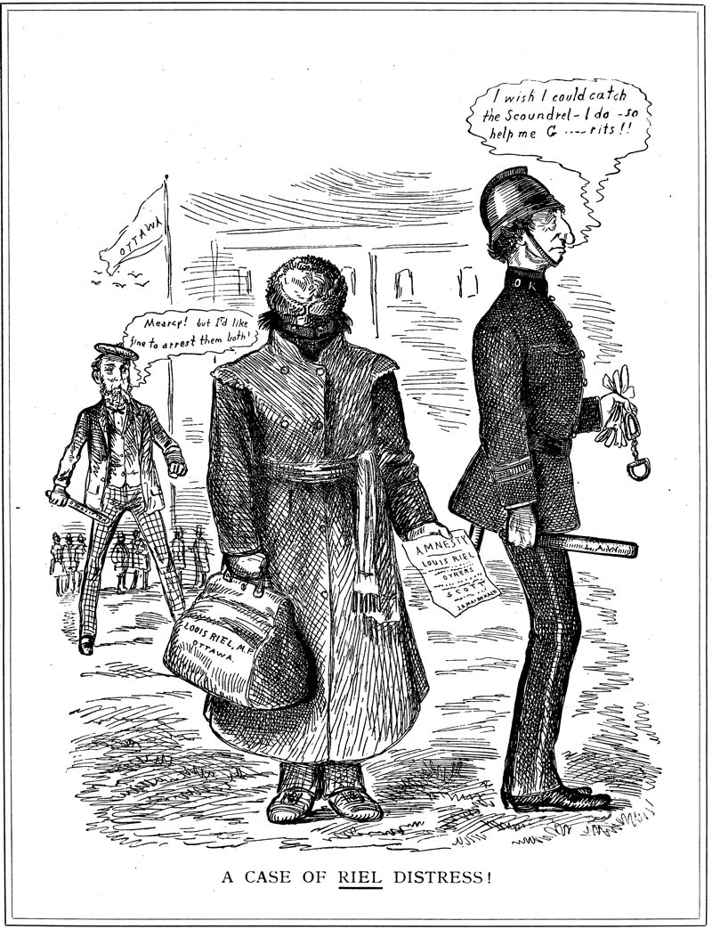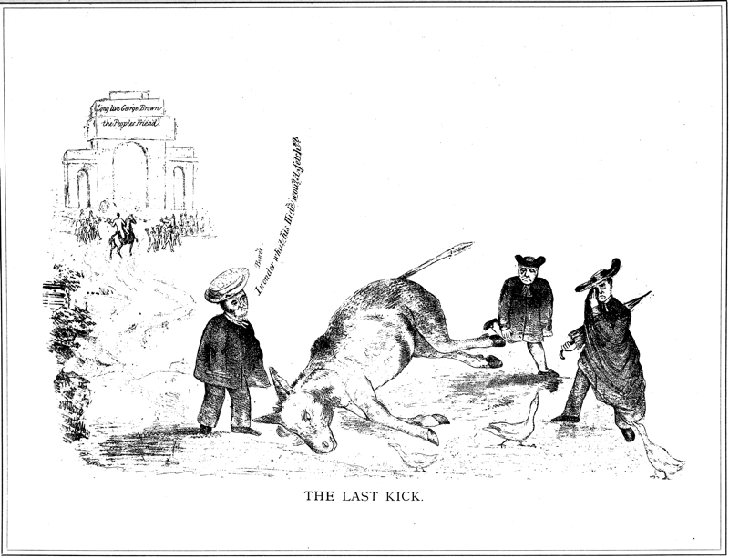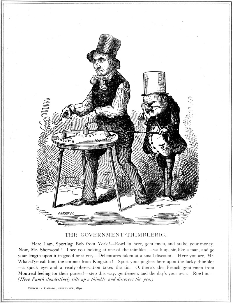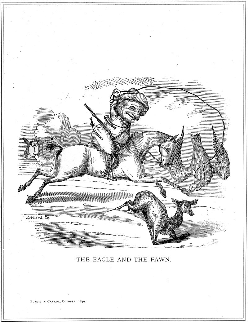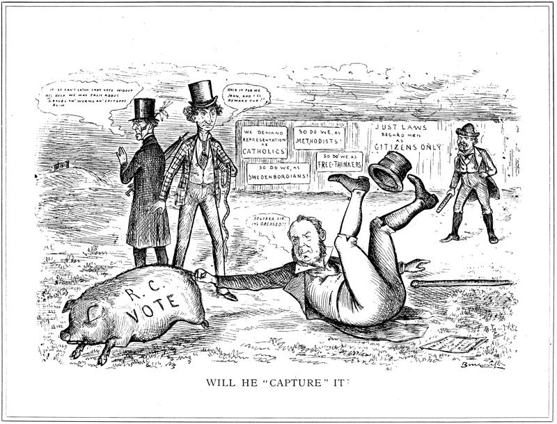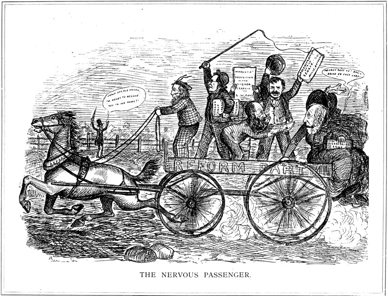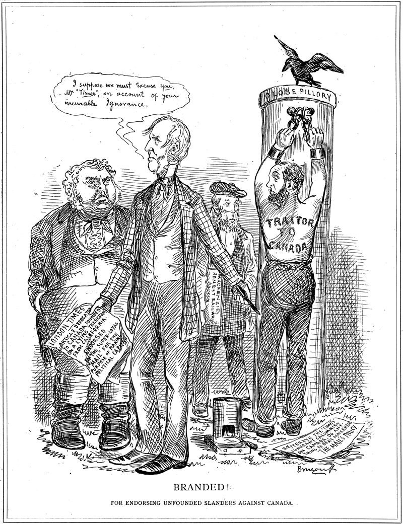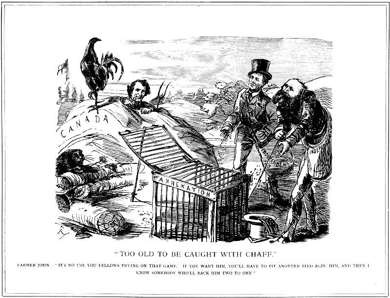 A “caricature history” does not mean that history is caricatured. On the contrary, a good caricature enables us to see, in a true light, facts that might otherwise be hidden or misrepresented. We understand current events and the social life of England from the illustrations of Punch more truly than from the columns of the Times or the Morning Post. Canada is only beginning life, and our politics touch subjects of general interest so seldom, that it is sometimes thought and said that there is no field for a Canadian Punch; but the fact, perhaps not generally known, that for the last forty years, at any rate, we have rarely been without artists whose pictures on the questions of the day have appealed successfully to popular humor, proves that our political life has been robust from the beginning. Some of these artists had to content themselves with publishing fly-sheets that provoked the laughter of the town, but that had no chance of obtaining more than a local reputation. For others, organs well-known in their day, such as Punch in Canada, Diogenes, and Grinchuckle, were established at different times prior to 1873, when Grip vaulted into the seat which he has occupied since to the satisfaction of all Canada. Requests have been frequently made for a work containing a continuous series of his cartoons, and in now acceding to these it has been thought well to give illustrations of what was done among us in the same line previously. Fortunately the publishers were able to obtain selections from the sources to which I have referred, and also from the Canadian Illustrated News; and the First Volume of this work thus gives something like a continuous pictorial history of the events that have stirred popular feeling most deeply since 1848. They believe that those older representations will be heartily welcomed, and they desire to thank all who have assisted in making the work so extended.